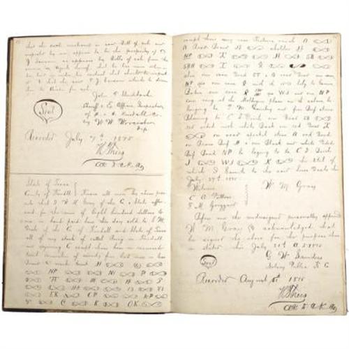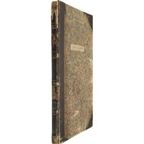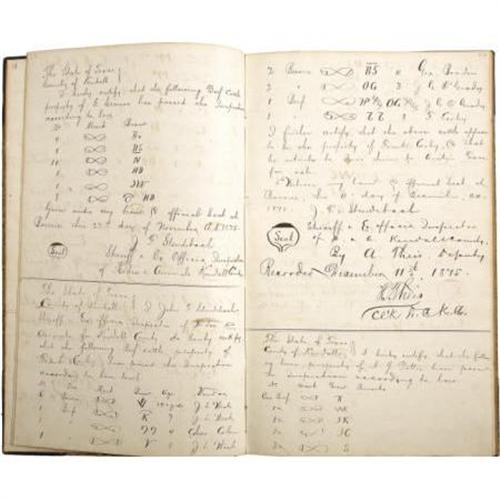 <B>Texas Cattle Trade: Motion and Execution Docket of the County Court of Kendall County, Texas from 1875-1880</B></I>. Measuring 8.25" x 13.75", this large ledger contains almost 200 pages of agreements and notes involving a voluminous number of cattle transactions conducted in Kendall County, Texas between 1875 and 1880. All pages appear to be in the hand of the county clerk. A typical entry in the docket, of which there are several dozen, shows a county-registered agreement between the parties involved, followed by the terms of the exchange, most including the number, brand, mark, age, and sex of the cattle to be traded. This is typically followed by an endorsement from the county clerk. Most interesting for Texas history buffs is the vast collection of brands included in this docket. There are literally hundreds of distinct brands representing ranchers from all over the state of Texas in the late-19th century, a real boon for the collector interested in the history of Texas commerce of the period. In addition, several famous cattlemen are mentioned in the docket, including George Washington Saunders and Andrew Jackson Potter. The docket is in about very good condition, with noticeable edge wear to the boards, including some surface loss at the head and tail of the spine. The interior pages, though minimally toned in a few places, remain remarkably clean and legible. A real find for anyone interested in the history of Texas cattle trading.<BR><BR><b>Shipping:</b> Books & Catalogs (<a target="_blank" href="http://www.heritageauctions.com/common/shipping.php">view shipping information</a>)