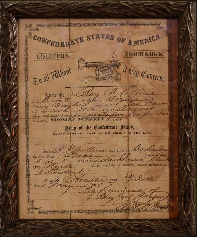 Framed Honorable Discharge document of the Confederate States of America, for Private B.F. Collins of Captain Boyce's Company, Texas Cavalry.