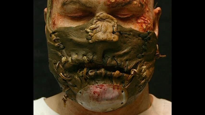 (New Line Cinema, 2006) This Leatherface mask was custom-made by the production and is very similar to the final screen used version. Used during the film's pre-production, this exact mask is seen in the special features segment of the film's DVD. The mask is constructed of molded foam with attached metal buckle and plastic chin guard. Detailed to look like leather sections held together with leather laces, giving this mask that iconic Leatherface look and feel.