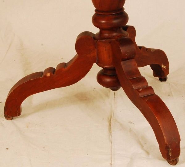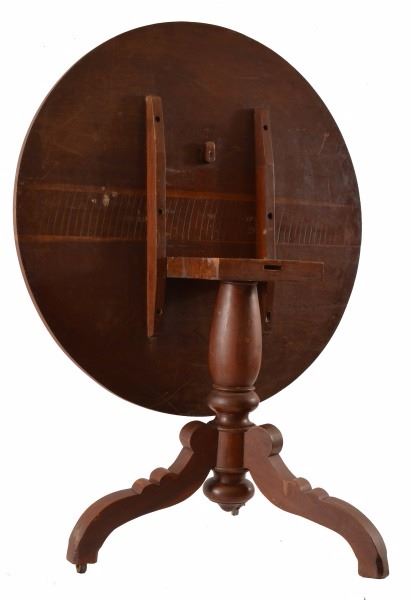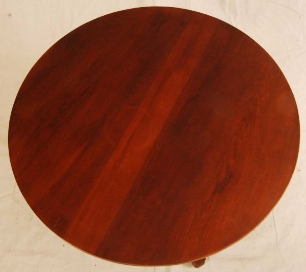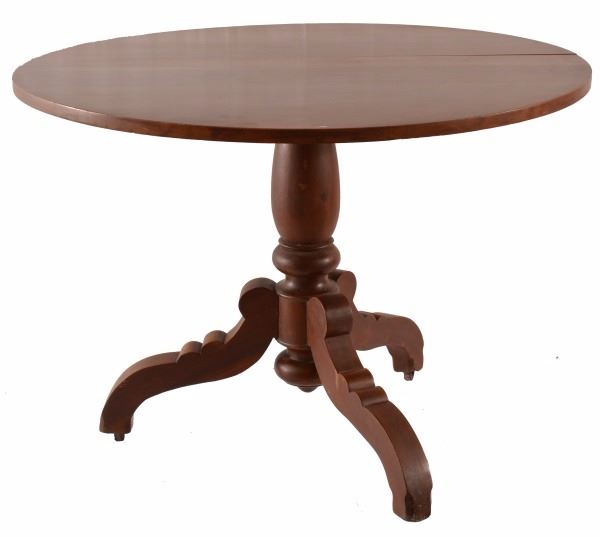 Texas Cherry & Walnut Center Table. Tri-pod, round, curved legs, 38''x29'' This middle 19th Century handmade center table measures 27-1/2” tall and is constructed of cherry and walnut. The 7/8” x 38” diameter cherry tilting top is composed of four random width boards. The boards attached on the edge and secured with glue and screwed cleats. It sits atop a turned pedestal with tripod legs.