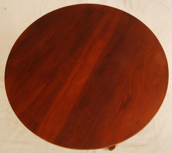 Tri pod, round, curved legs, 38''x29'' This middle 19th Century handmade center table measures 27-1/2” tall and is constructed of cherry and walnut. The 7/8” x 38” diameter cherry tilting top is composed of four random width boards. The boards attached on the edge and secured with glue and screwed cleats. It sits atop a turned pedestal with tripod legs.