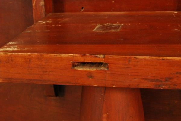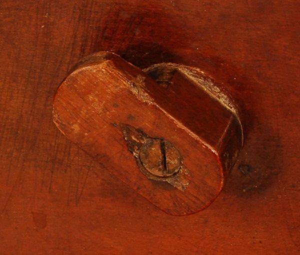 The tilting assembly consists of two 1” x 22” tapered cleats, which are attached by two hidden pegs to the 1-1/2” x 10-1/2” x 11” walnut pivot block. The top pivots at a 90 Degree angle against the rounded-over block. A wooden keeper (attached by one screw) secures the top to the pivot black. A 1-1/2” x 1-5/8” x 1-3/4” mortise (in the pivot back) accepts the tenoned pedestal.