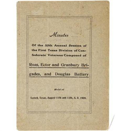 <B>Minutes of the 35th Annual Session of the First Texas Division of Confederate Veterans Composed of Ross, Ector and Granbury Brigades, and Douglas Battery. </B></I> Quitman: Democratic Print, 1909. Octavo. 16 pages. Wraps. Two vertical folds throughout. A few small tears to the wraps. Contents toned. Good condition.<BR><BR>A souvenir from a meeting of Texas Confederate Veterans held on August 11 and 12, 1909 in Terrell, Texas. <BR><BR><BR><b>Shipping:</b> Books & Catalogs (<a target="_blank" href="http://www.heritageauctions.com/common/shipping.php">view shipping information</a>)