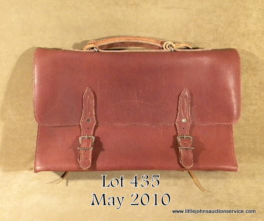 Texas Custom made large leather briefcase, approx. 19” long by approx. 11” high and approx. 5” wide with two interior compartments, a heavy duty carrying handle and two securing belt buckles and straps for the cover flap. In overall very goodcondition with some light scratches to exterior from carry. Est.: $75-$150.