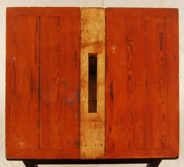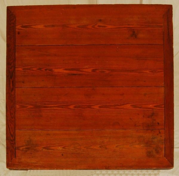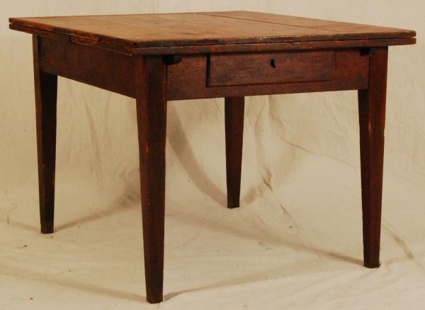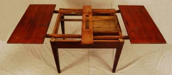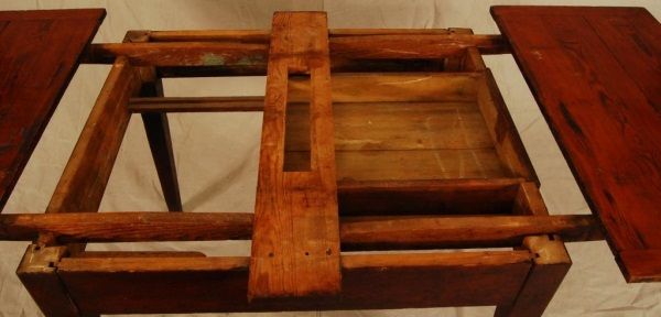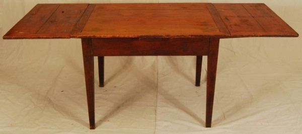 The table measures 29" tall, 37" wide and 78" long when fully extended. The top contains four ¾"X9-1/2" heart pine boards, which is framed and mitered at the corners. These boards are tenoned into the mortised frame, which are exposed. The extensions rest below the top and contain two battens, which provides the sliding mechanism. The two-board extension leaves are similarly constructed as that of the top. However, the heart pine boards are oriented normal the "exposed" top. The mortise and tenon frame is made of ash. The 1"x5-1/2" skirt recessed to the tapered legs. The skirt contains two notches, which allows the battens to slide upon. The legs are 2-5/8" square at the top and taper on the inside to 1-3/8" square at the floor. The exposed corners of the leg is rounded over. A single drawer is located on the narrow side of the table. The edges of the drawer front is rounded over and overlaps the skirt. It is joined using dovetail construction. The drawer bottom is chamfered to fit the dadoed drawer runners. The drawer contains a mortise lock. The inside of the drawer reveals the original paint color. Missing a drawer pull.