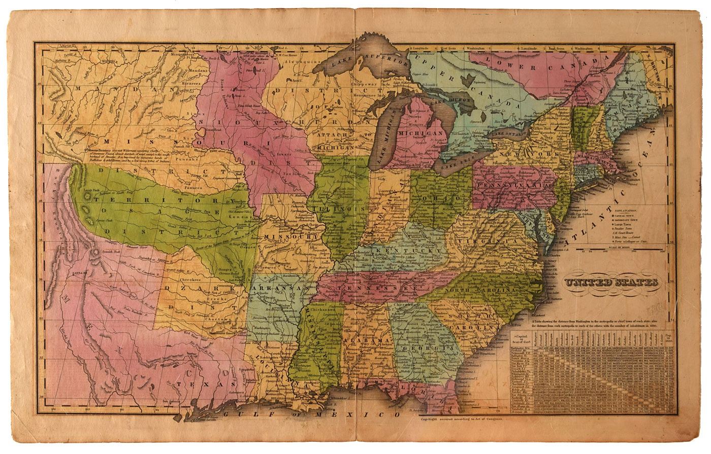 Uncommon color 18.75 x 11.75 map of the United States from the ‘Huntington's School Atlas, Drawn and Engraved Expressly to Illustrate and Accompany the System of Modern Geography,” published by Nathaniel G. Huntington in 1833. This early map of the United States stretches to the Rocky Mountains and shows Texas as a part of Mexico. A large Missouri Territory covers the middle of the country and is filled with Indian districts including the Sioux, Mandan, Osage and Ozark tribes. Wisconsin is shown as "Attach’d to Michigan.” The map of America also shows Mexico in control of the Southwest and the US border with Canada extends well into British Columbia, reflecting the American government’s interest in the region. In fine condition, with tape repairs to splitting at the ends of the central vertical fold.