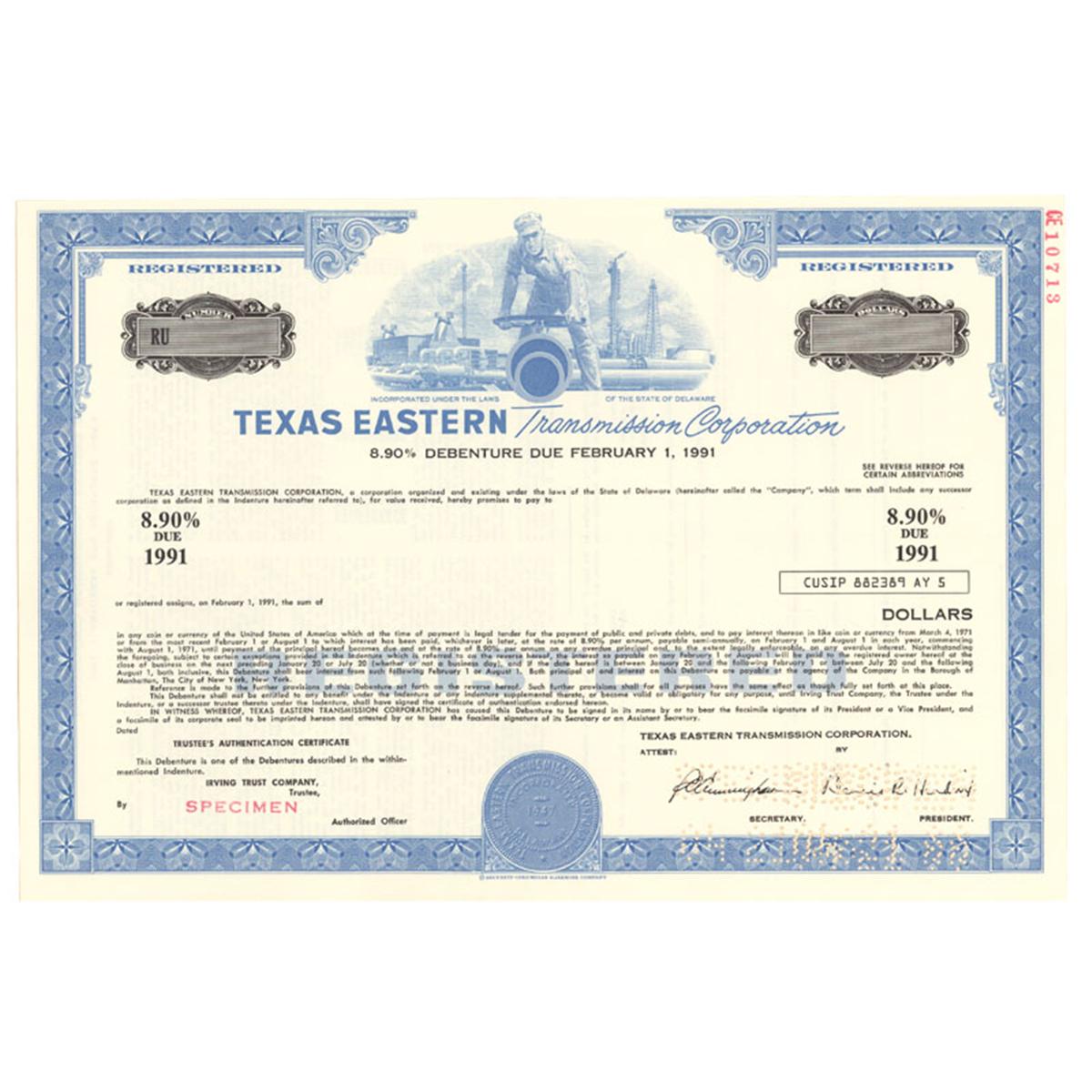[SPECIMEN] ----, Delaware. 8.9% debenture in Texas Easter Transmission Corporation. Blue / Black. Vignette of a worker bending over a pipe valve with buildings and derricks in background at top center. Perforation cancellation at lower right. Very Fine.