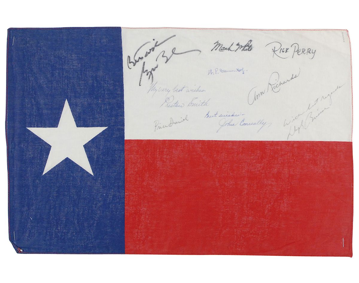 Printed fabric Texas state flag, 18 x 12, signed in the white section in ballpoint and felt tip by nine former governors. Signers are: Price Daniel, John Connally, Preston Smith, Dolph Briscoe, William Clements, Mark White, Ann Richards, George W. Bush, and Rick Perry. In fine condition.