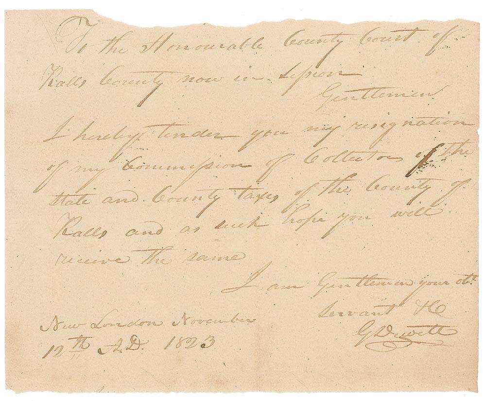 Empresario in Mexican Texas. He founded the Dewitt Colony, one of the most successful. Rare ALS signed “G. Dewitt,” one page, 7.25 x 5.5, November 12, 1823. Short letter of resignation. In full: “To the Honourable County Court of Ralls County now in Session. Gentlemen. I hereby tender you my resignation of my Commission of Collector of the State and County taxes of the County of Ralls and as such hope you will receive the same.” All writing a shade or two light, rough top edge, and a uniform shade of mild toning, otherwise fine condition. Though he did not live to see the battle of Gonzales, which traditionally is considered the first skirmish of the Texas Revolution, Dewitt’s wife and daughter, Naomi, cut up Naomi's wedding dress to make the ‘Come and Take It’ banner that his fellow colonists adopted as their battle flag