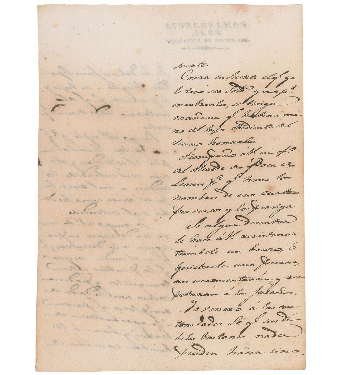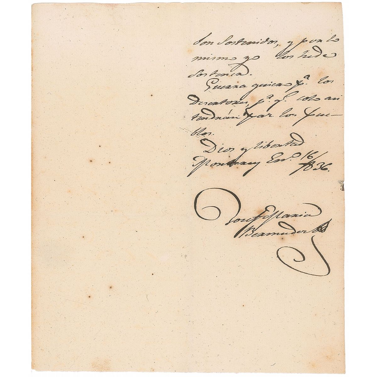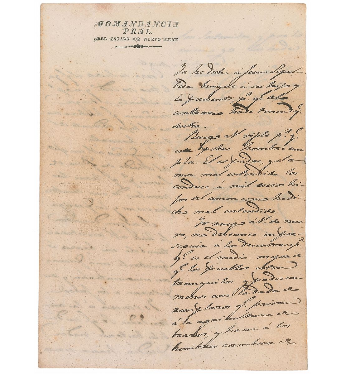 ALS in Spanish, signed “Jose Maria Bermudez,” three pages on two adjoining sheets, 6.5 x 8.25, stamped Comandancia Pral. del Estado de Neuvo Leon letterhead, January 16, 1836. In part (translated): “I have already told Jesus Sepulveda to bring his son in and present him. Because if he doesn’t he surely will be sorry…I beg you to repeat it so this poor man does so. He is a father, and misplaced love causes a thousand excesses…Do not rest in persecution of deserters…He who is drafted must run his luck and should not be protected from it…If any deserter resists, shoot an arm off, or break a leg, so that in this way they will learn a lesson and respect the judges…God and freedom.” In very good condition, with trimmed edge to second page, with a horizontal fold through first two names of signature, intersecting folds, and some scattered light toning (heavier to first page).