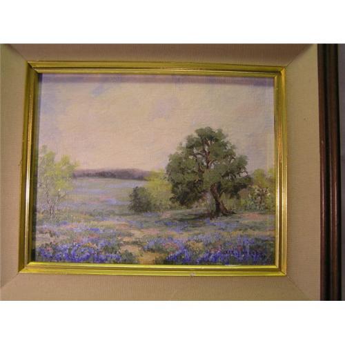 Hazel Massey was a regional, impressionist artist from San Antonio, TX. She was born on 1907 and died in 1990. Most of her work was done in the 1950's. This one is a charming and typical Texas landscape featuring their beautiful state flower, the Blue Bonnet. The painting is on artist board and is in very good condition. The frame is in ok condition, but, frankly, it's not a very attractive frame. Appears to be the original frame, however. I would have it reframed.