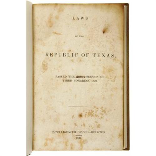<B><I>Laws of the Republic of Texas, Passed the First Session of Third Congress, 1839.</B></I></B></I> (Houston: Intelligence Office, 1839.) Second issue with same title, imprint, and date as first issue, but with four additional laws on a new sheet marked "<I>O</B></I>," with a slip indexing the additional laws pasted at foot of p. v. Octavo. This issue includes a fourteen-page index to the <I>Laws of Texas</B></I> following the five-page index to the <I>Laws of the Third Congress</B></I>, this being one of the few known copies containing these items. Of note in the laws listed is "<I>An Act entitled an act appropriating certain lands for the establishment of a general system of education,</B></I>" which stated "<I>That each county of this Republic shall have three leagues of land surveyed and set apart for the purpose of establishing a primary school or academy ... provided, that said lands shall not be surveyed in tracts less than one hundred and sixty acres.</B></I>" Full gold-stamped leather. Minor to moderate age toning throughout, else fine. <I>From the collection of Darrel Brown.</B></I><BR><BR><B>Reference:</B></I> Streeter <I>Texas</B></I> 355A. Raines, p. 230. Sabin 94999.<BR><BR><b>Shipping:</b> Books & Catalogs (<a target="_blank" href="http://www.heritageauctions.com/common/shipping.php">view shipping information</a>)