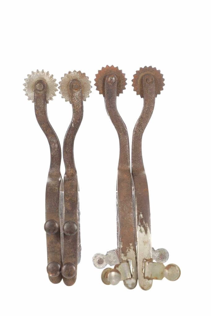 Featured in this lot is this Texas long shank spur collection, circa 1890-1910. There are two pairs of spurs in this collection. The first is an iron Texas long shank, single piece spur with a sunburst rowel and swivel spur strap buttons. The second pair is of the same design with a Texas long shank construction and a sunburst rowel and double spur strap buttons. The condition of these spurs is fair, with no obvious signs of damage; heavy oxidation is shown on both pairs of spurs. The measurements of these spurs are 1 1/4" x 4" x 6 1/2" and 1" x 4 1/4" x 6".