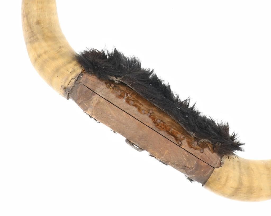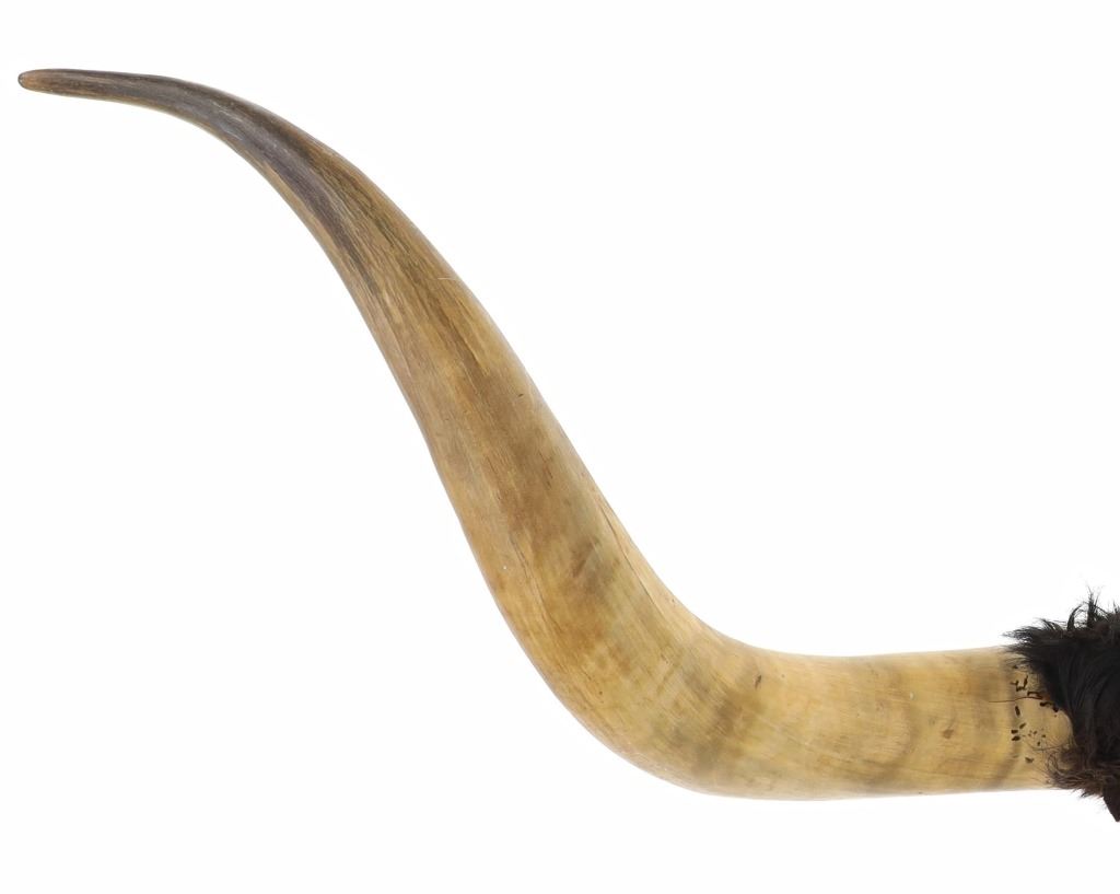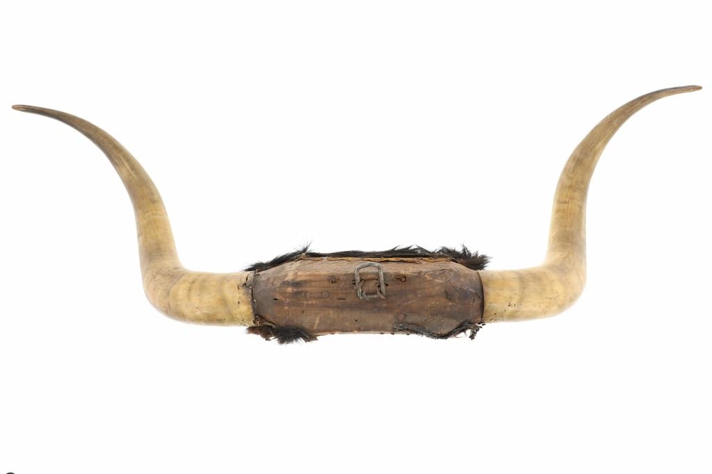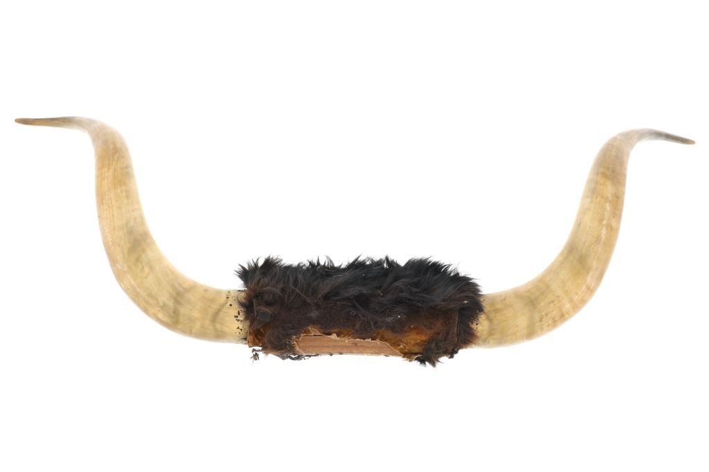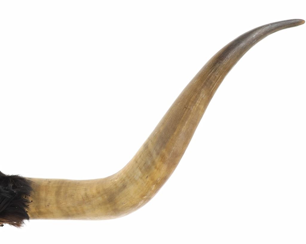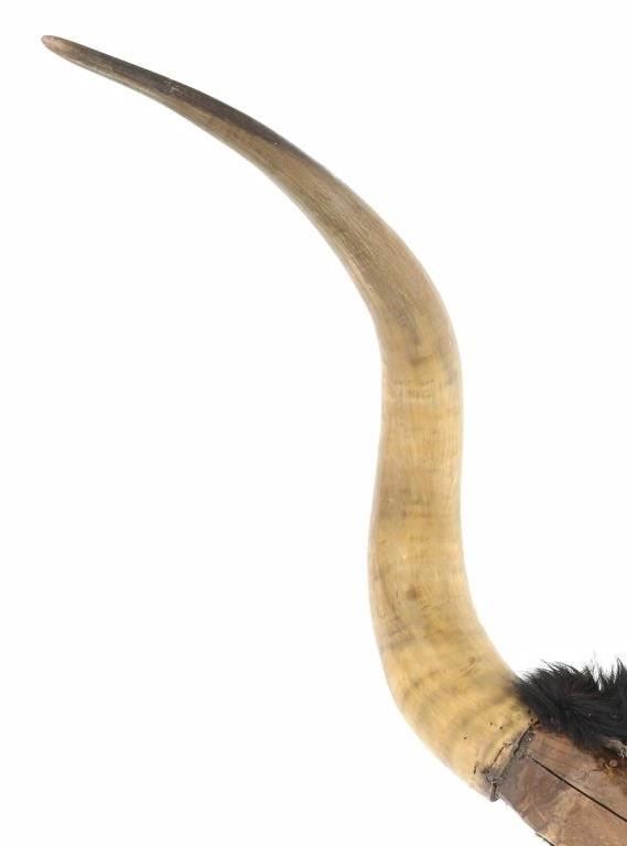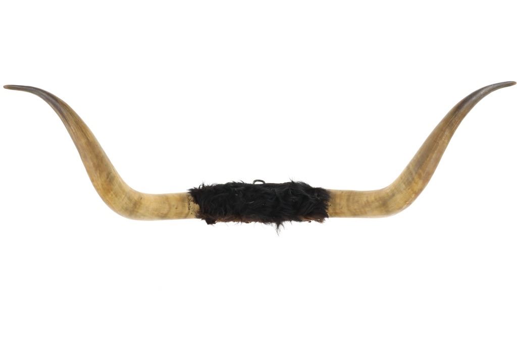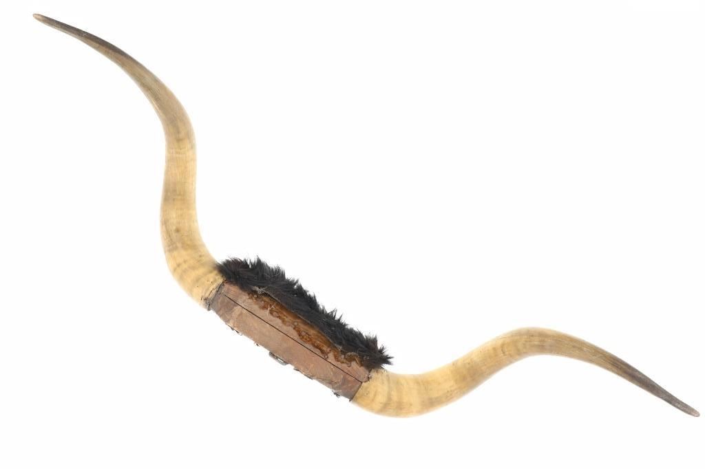 Featured in this lot is a Texas Longhorn steer hide wrapped wall mount. The wall mount features a wonderfully and professionally crafted taxidermy construction that shows two exemplary examples of steer horns with the shield and the joint of the horns wrapped by cowhide with the hair still attached. The condition of this longhorn steer horn wall mount is good with no obvious signs of damage and shows good overall condition. The measurements of this Longhorn steer mount are 11" x 12" x 43 1/2". The collective weight is 5lb 12oz.*