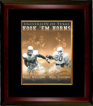 At the University of Texas, Earl Campbell won the Heisman Trophy in 1977 and led the nation in rushing with 1,744 yards. He was also a consensus All-America choice in 1977. He was selected as the Southwest Conference running back of the year in each of his college seasons and finished with 4,444 career rushing yards. Ricky Williams holds or shares 20 NCAA records while at Texas, and became the NCAA Division I-A career rushing leader in 1998 with 6,279 yards. Williams won the Heisman Trophy in 1998, becoming the second Texas Longhorn to win this honor. This "Hook Em Horns" Texas Longhorns 16x20 Photo is hand autographed by Earl Campbell and Ricky Williams. Certificate of Authenticity from Athlon Sports. Custom Black Mat and Premium Mahogany Color Framed as shown.