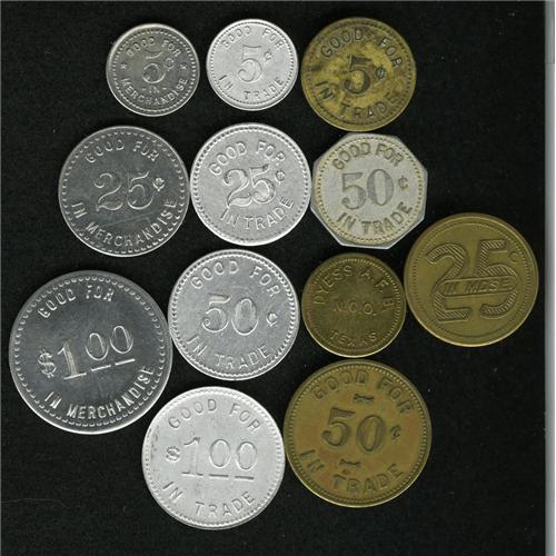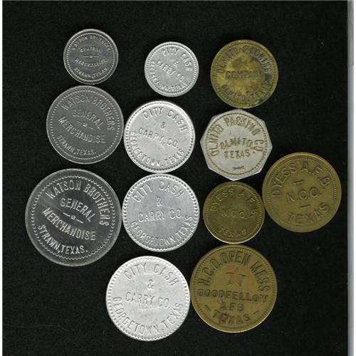 <B>Texas Merchants Group.</B></I> Consists of merchant's tokens from the following towns: Watson Brothers General Merchandise, Strawn, Texas, Good For $1.00, 25 cents, and 5 cents; a four-piece set from City Cash & Carry Co., Georgetown, Texas, denominations of 5, 25, and 50 cents and $1; two different tokens from Olmito Packing Company, Olmito, Texas, Good For 5 cts in Trade and 50 cts in Trade; two tokens issued by Dyess A.F.B., N.C.O. Texas, Good For 25 cts in Merchandise and Good For 5 cts in Merchandise; and a 50-cent token issued by N.C.O. Open Mess, Goodfellow A.F.B., Texas, Good For 50 cents.<BR><BR><b>Shipping:</b> Coin/Currency (<a target="_blank" href="http://www.heritageauctions.com/common/shipping.php">view shipping information</a>)