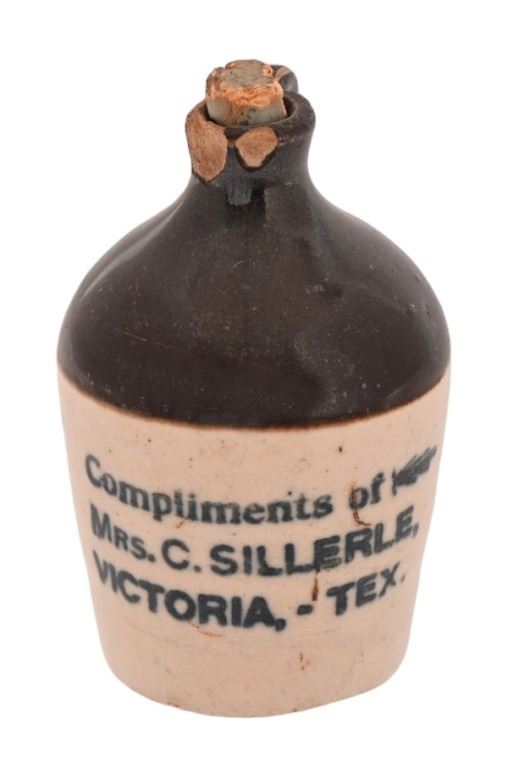 Blue Stenciled Salesman Sample Mini Jug "Compliments of - Mrs. C. SILLERLE, - VICTORIA, TEX."