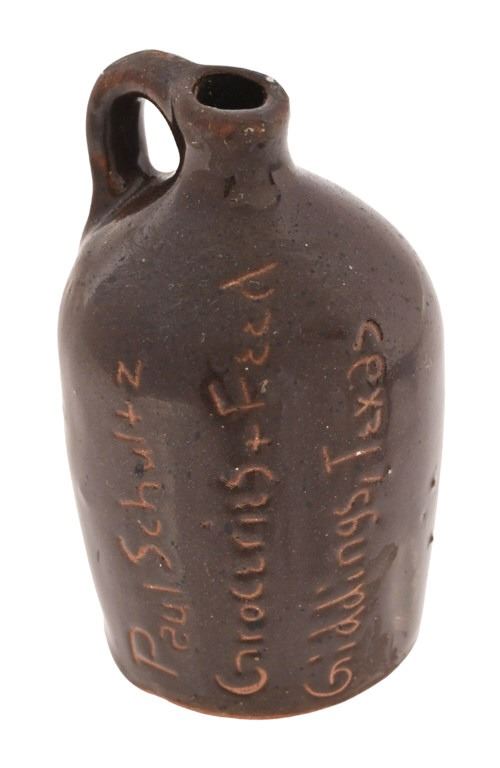 Scratched Salesman Sample Mini Jug "Paul Schultz -Groceries & Feed - Giddings, Texas"