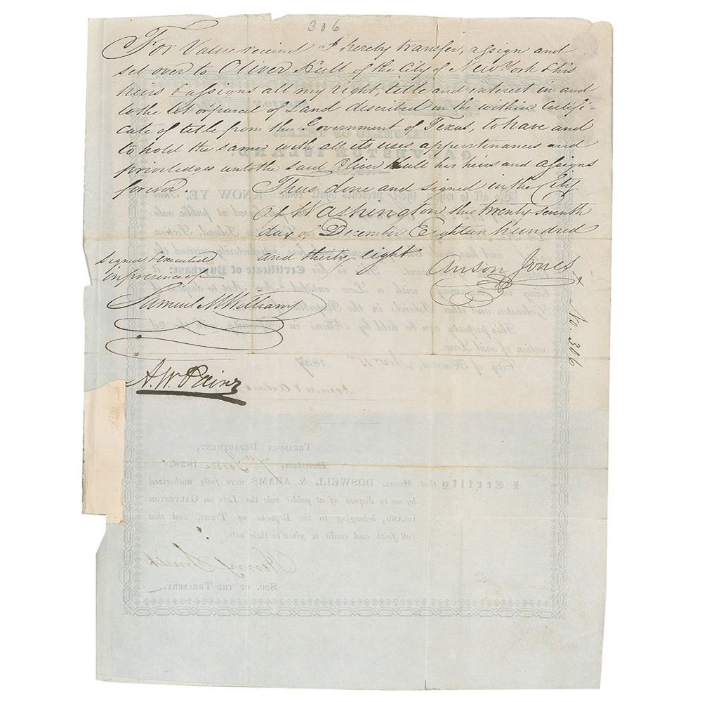 Two items: a partly-printed DS signed “Mirabeau B. Lamar,” one page, 16.5 x 10.75, August 25, 1840, general land office document granting Oliver Hull 10 acres of land on Galveston Island, signed at the conclusion by Lamar as president of Texas; and a DS, signed “Anson Jones,” one page, 8.5 x 10.75, December 27, 1838, a certificate of purchase in “conformity with a Law entitled ‘An Act to dispose of Galveston and other Islands in the Republic of Texas,” in relation to his purchase of 10 acres on Galveston Islands, with Jones on the reverse transferring and assigning “to Oliver Hill of the City of New York…all my right, title, and interest in and to the lot or parcel of Land,” with Jones signing below. Attached to the front of the Jones certificate is a manuscript bill of sale signed by Hull and assigning the property to his relatives for the sum of $106; also included is a land survey related to the Hull land. In overall fine condition.
