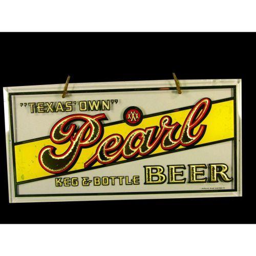 Texas Own Pearl Beer Reverse Glass Chain Hanger Sign. Minor paint discoloration in yellow back otherwise excellent condition. 20 X 10 inches.