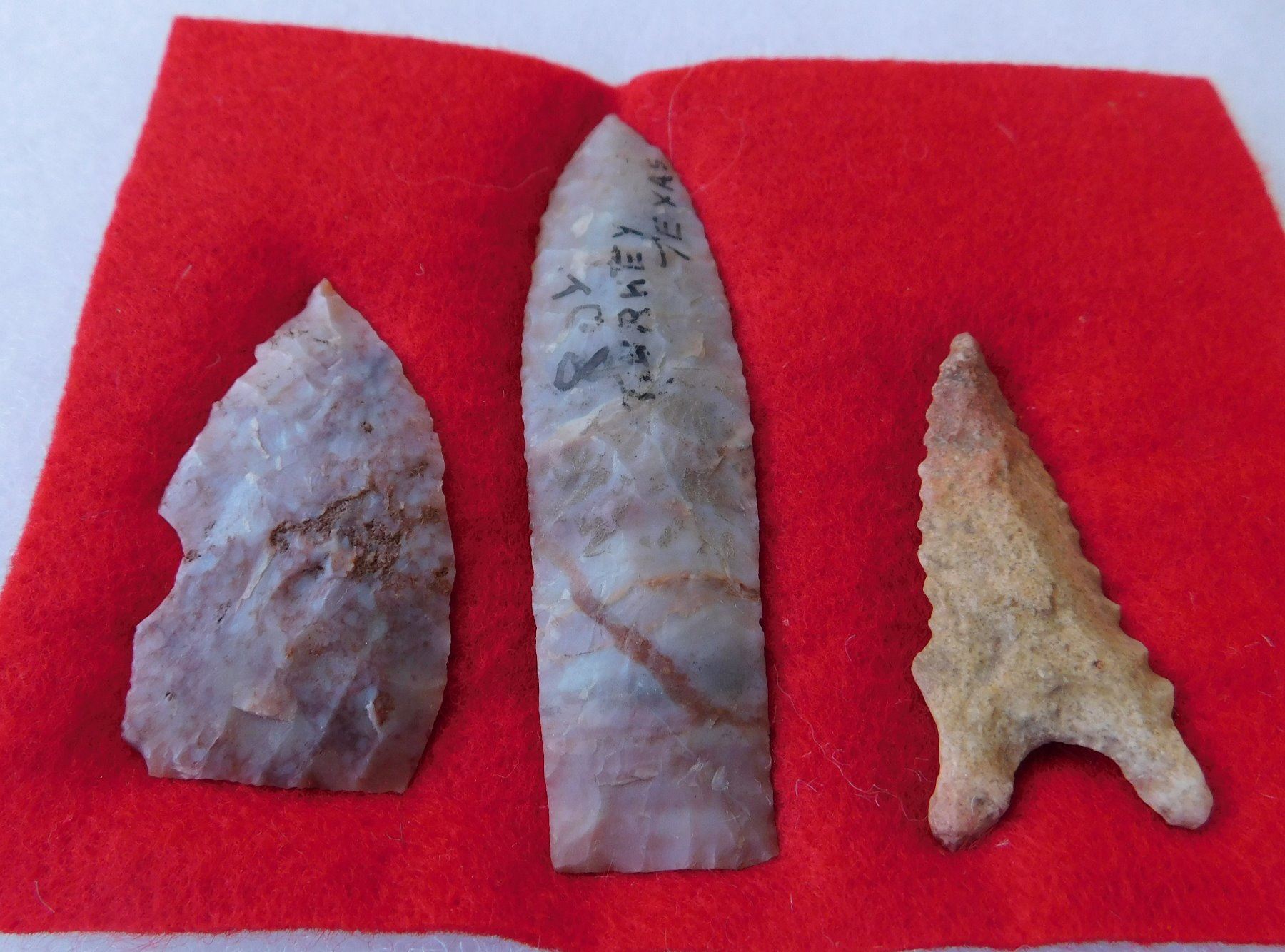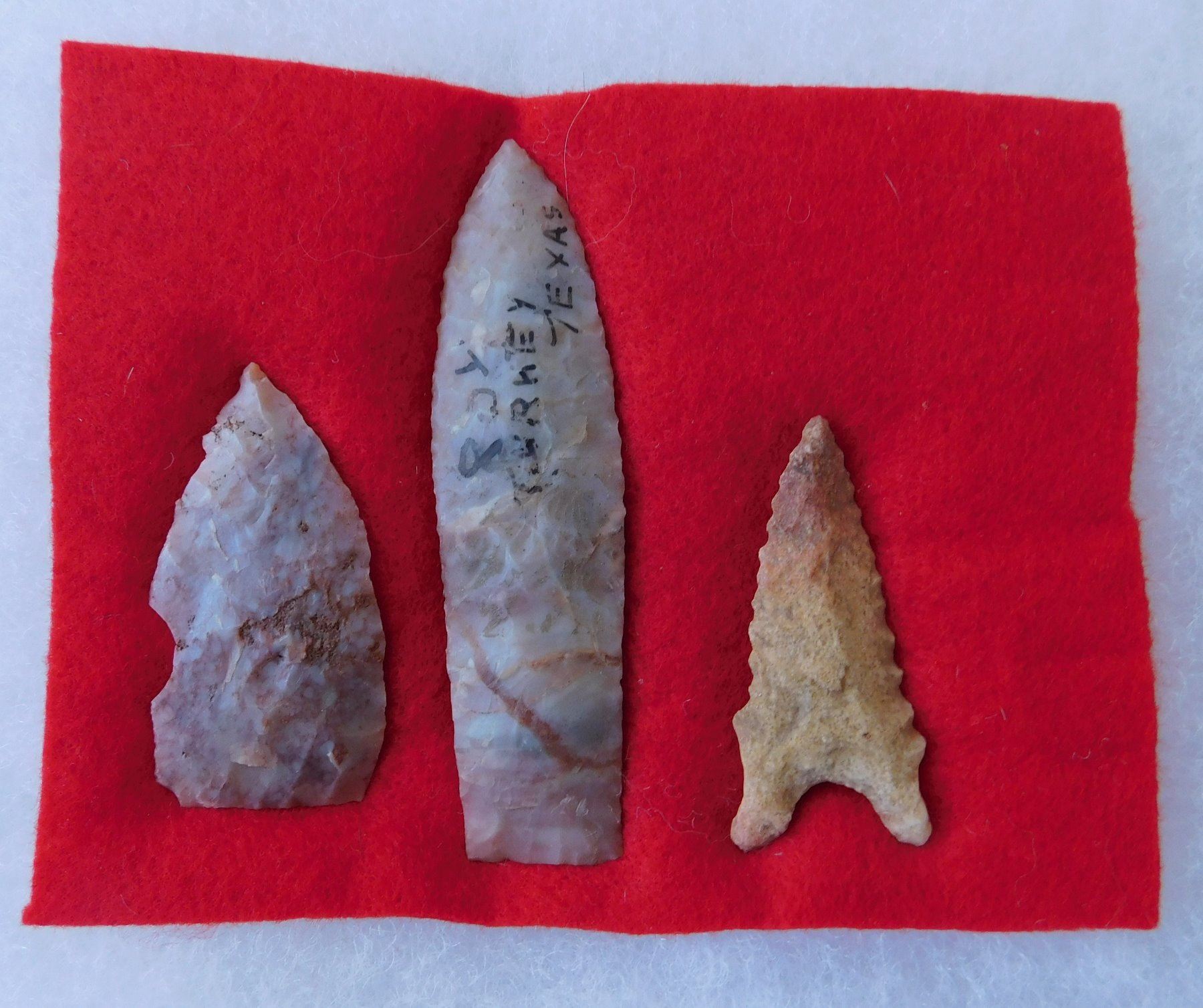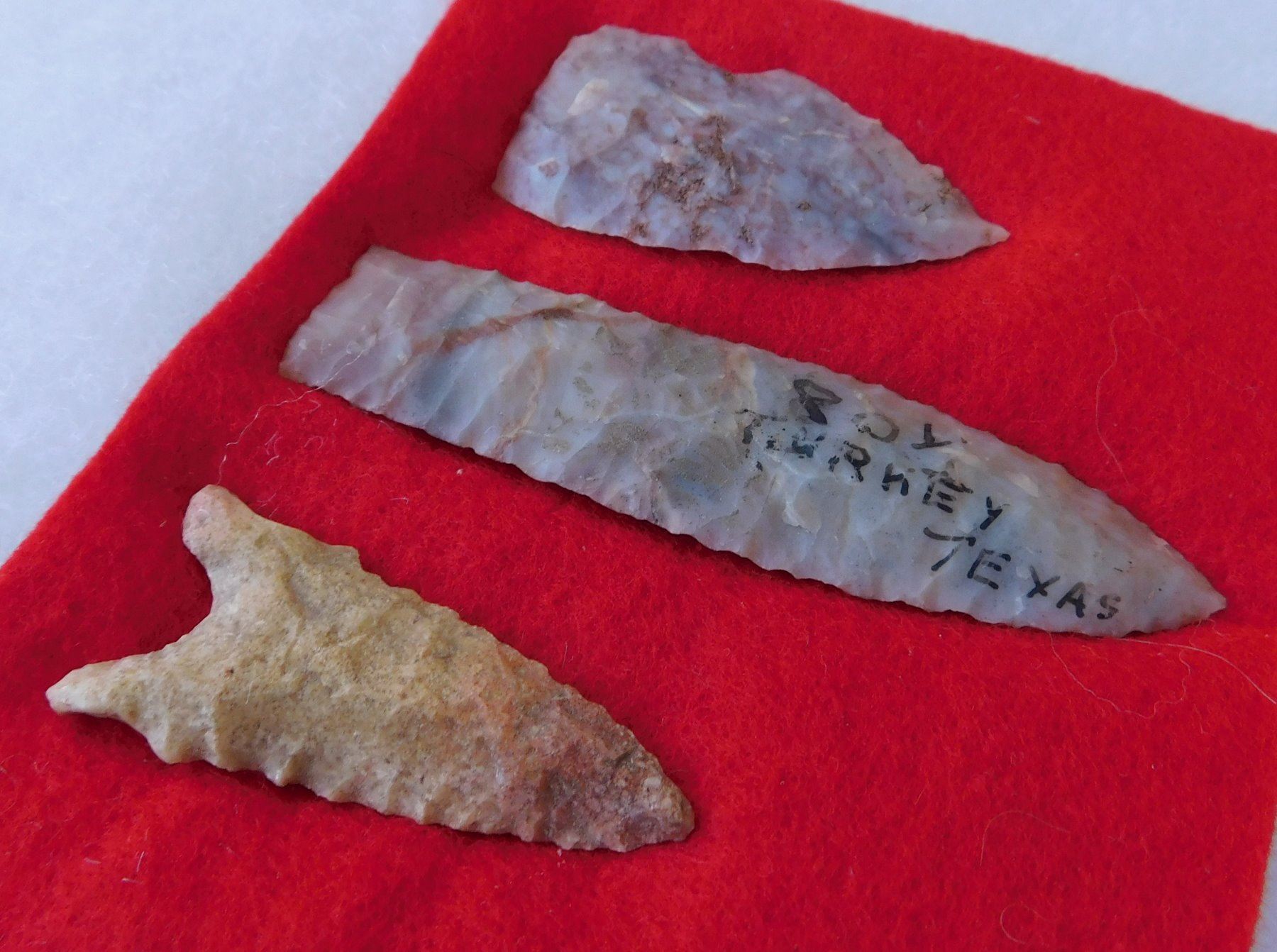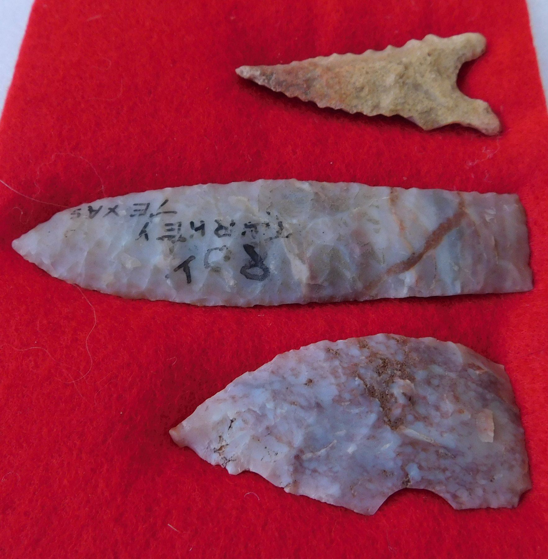 Texas Paleo Flint Collection, paleo to archaic periods. Made of chert and alibates flint, the items measure from 1 7/8" to 3 1/8". Turnkey, Texas. Frame not included. Condition: Good, see images. Shipping: $22.50 w/insurance and signature.