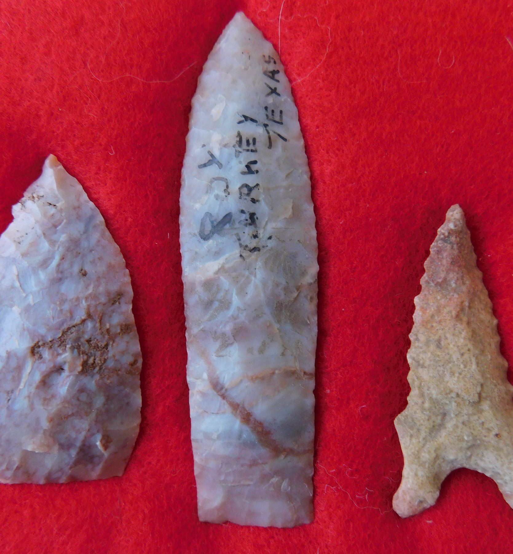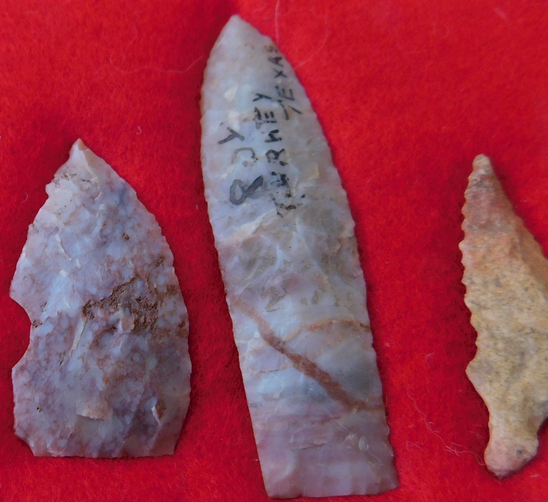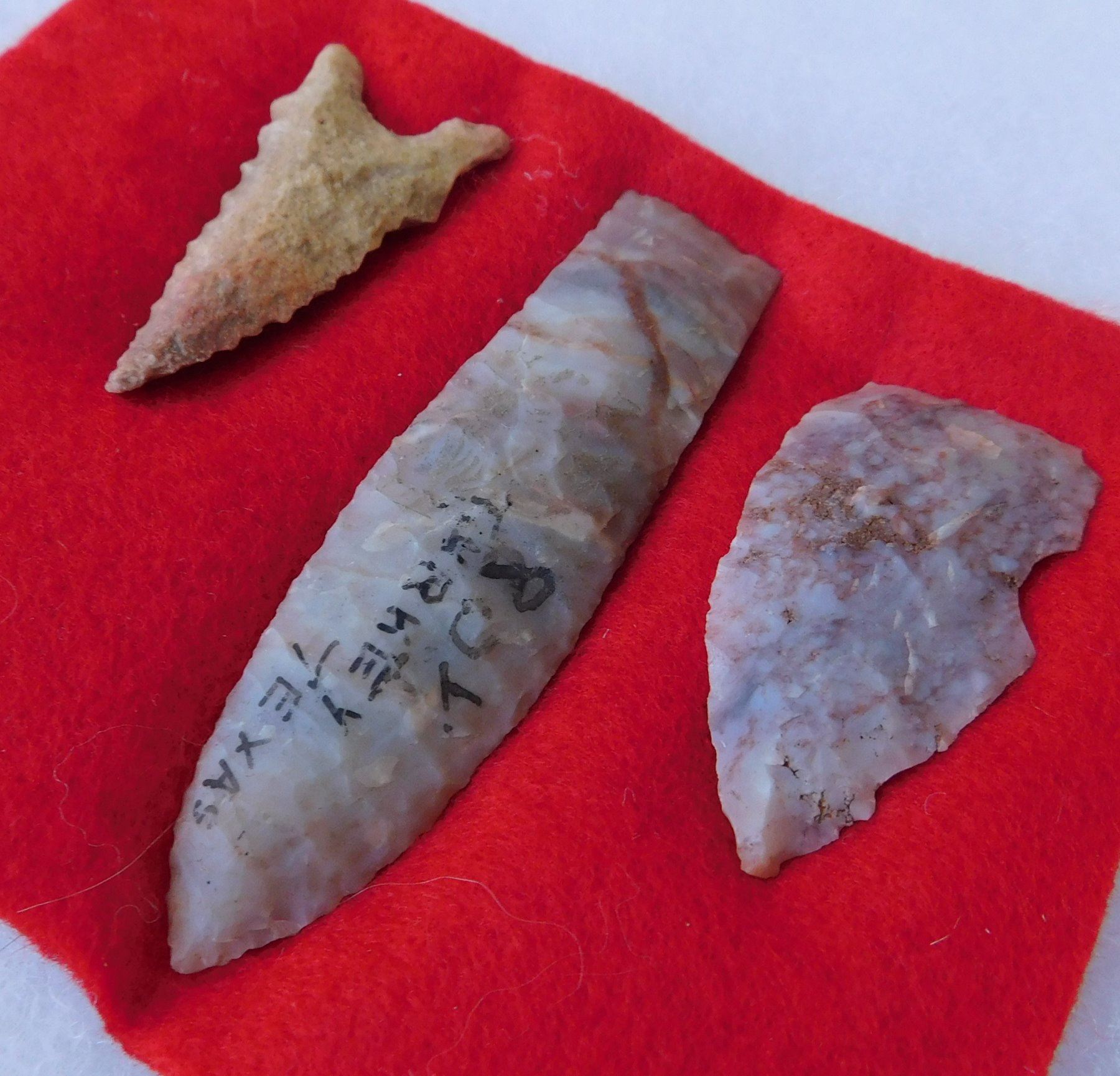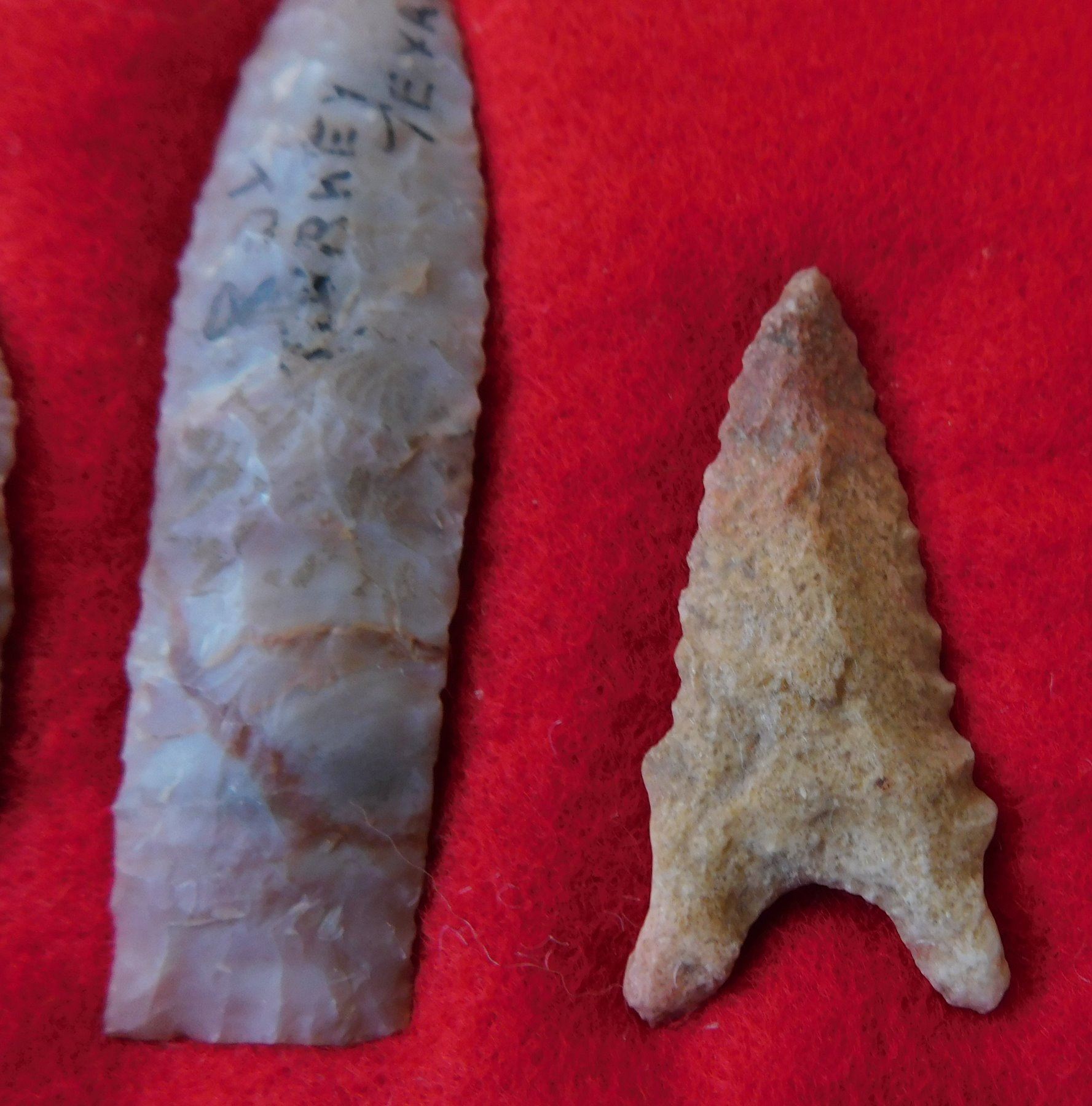 Texas Paleo Flint Collection, paleo to archaic periods. Made of chert and alibates flint, the items measure from 1 7/8" to 3 1/8". Turnkey, Texas. Frame not included. Condition: Good, see images. Shipping: $22.50 w/insurance and signature.