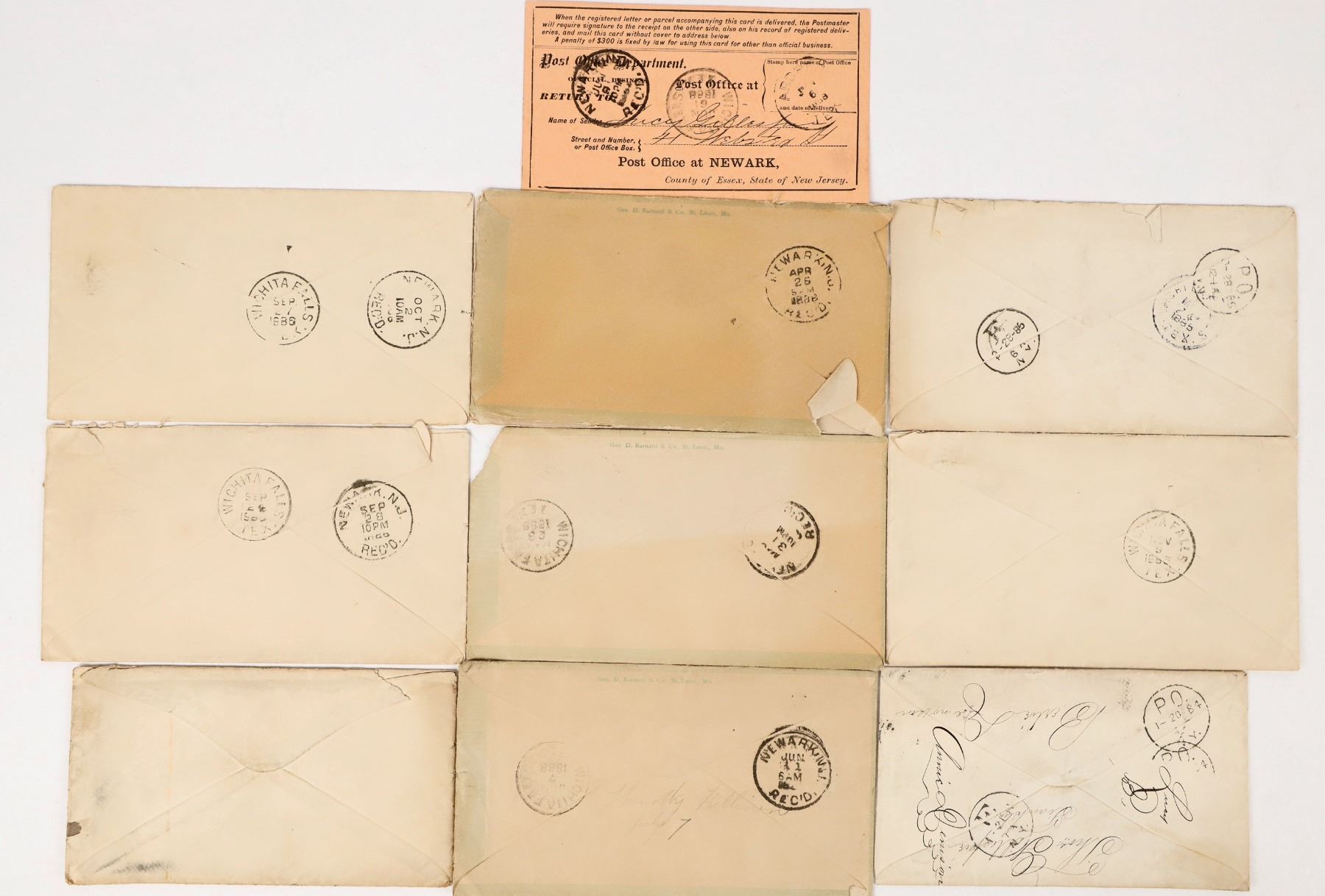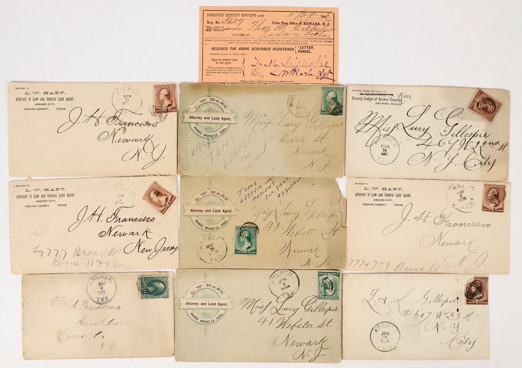 Nine postal pieces from Archer City Texas, 19th century. 1888 registry return receipt; postal cover from L. W. Hart, attorney and land agent to Newark N. J.; postmarks from 1883, 1884; six two cent stamps with cancellations.