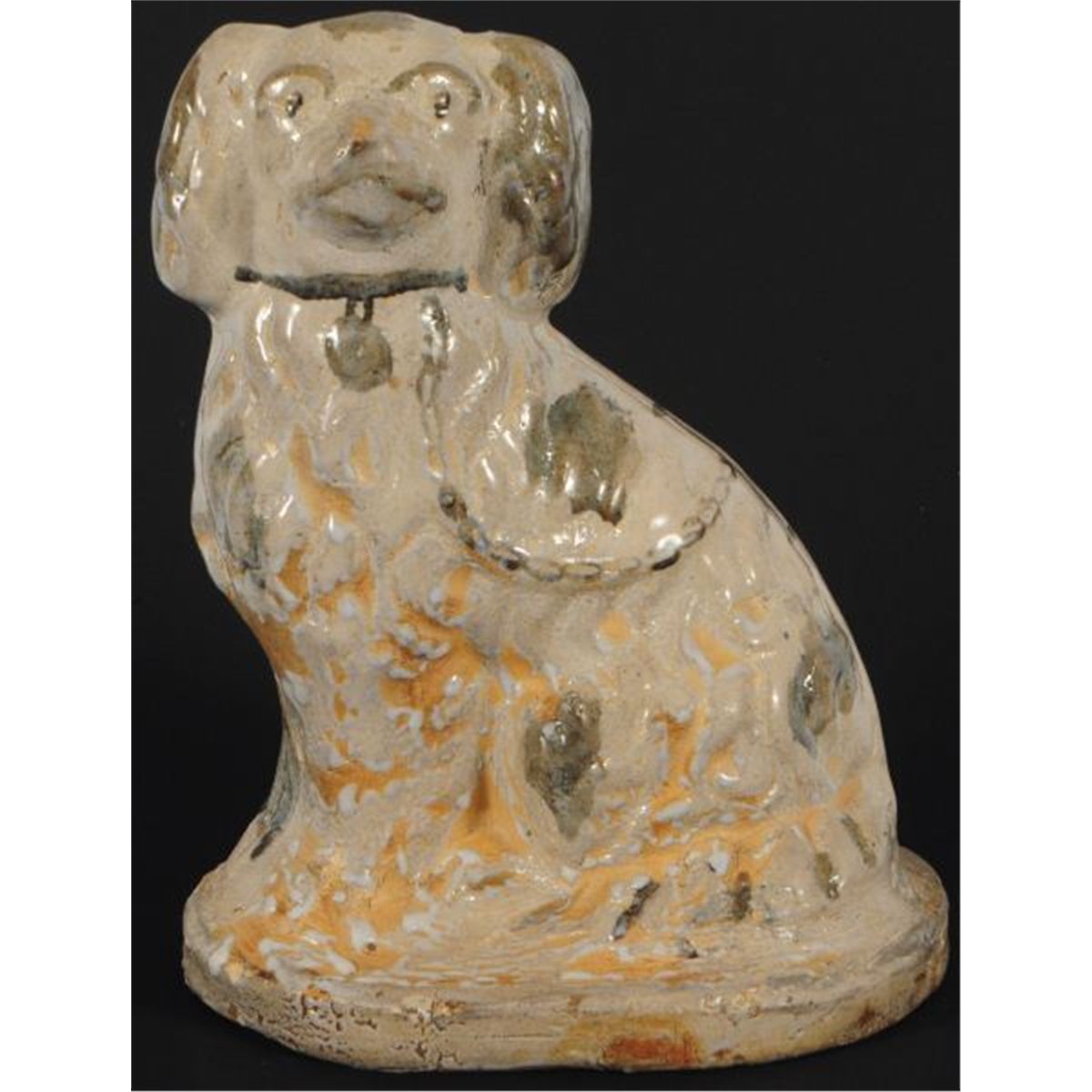 Spaniel Doorstop. Bristol glaze with blue sponge decorations. East Texas origin. Hogue Pottery, Winfield and Mt. Pleasant, Texas Normal wear to the back. Circa 1920. Collected in East Texas in the late 70’s and early 80’s. Has been broken and reglued at the base.