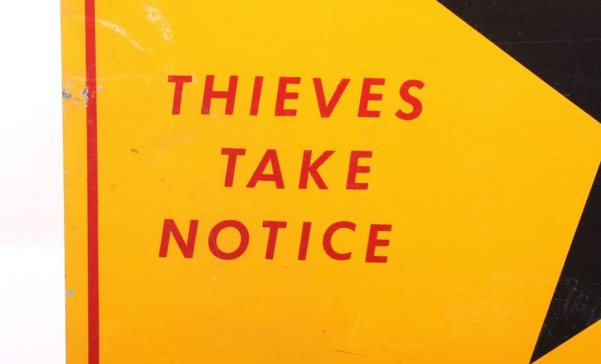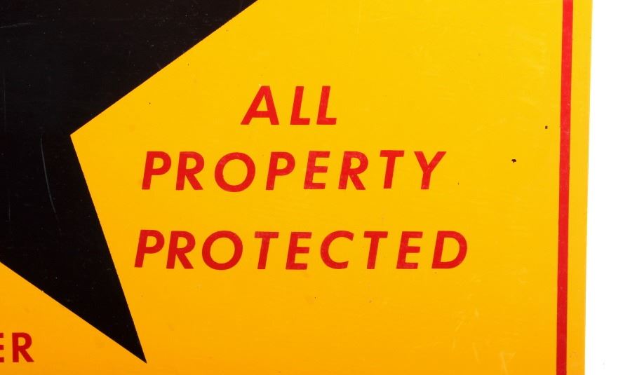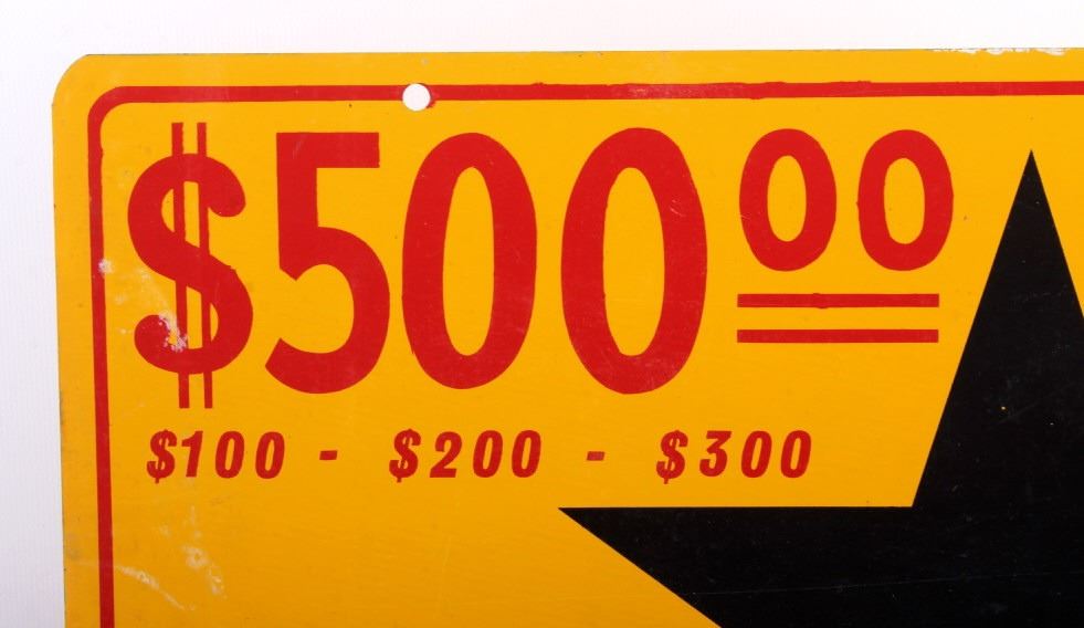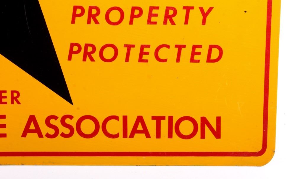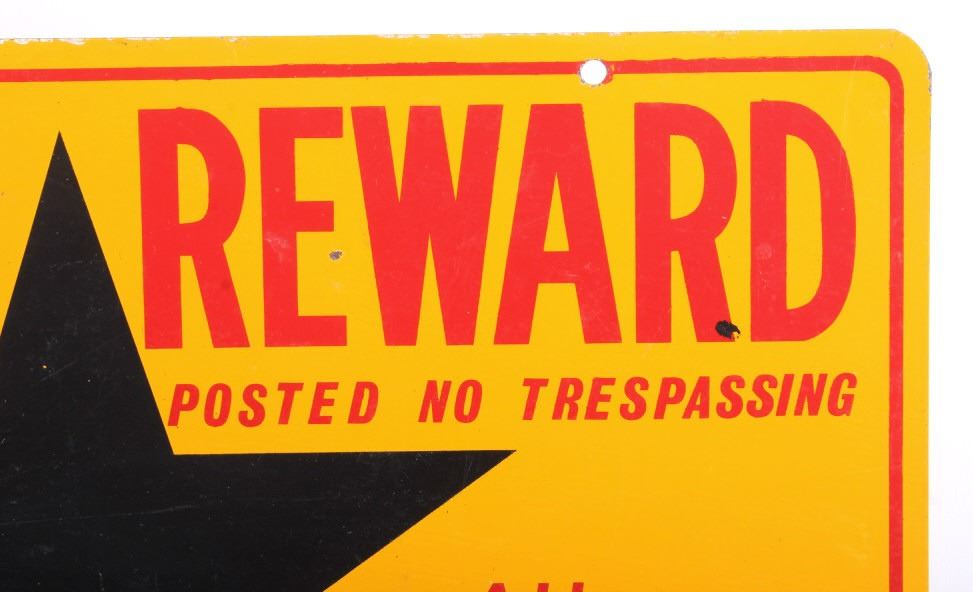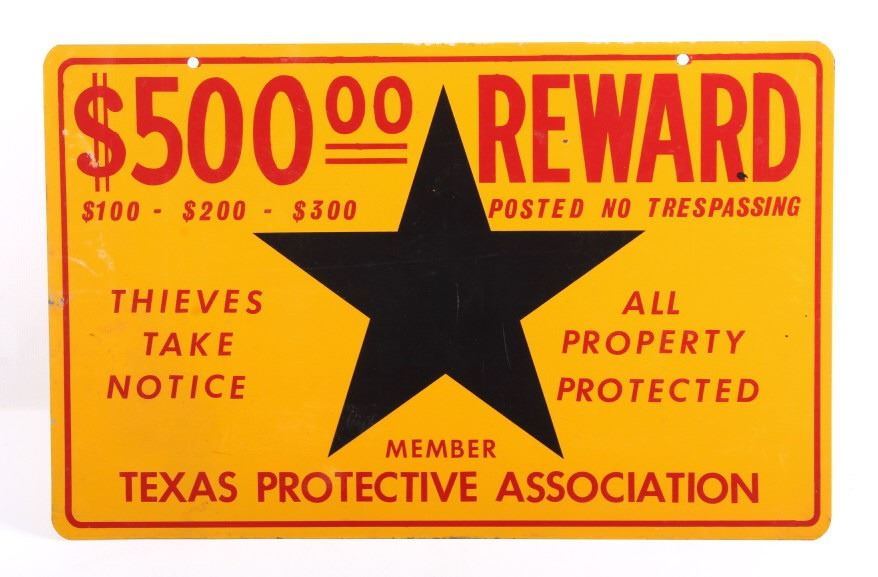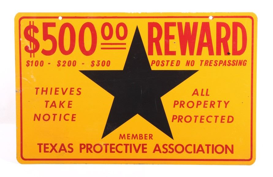 This is a Texas Protective Association reward sign. The sign shows a bright, vivid yellow with red lettering that reads "$500 Reward / Posted No Trespassing / Thieves Take Notice / All Property Protected / Member Texas Protective Association". The sign is in good condition. It measures 10" x 15.75".