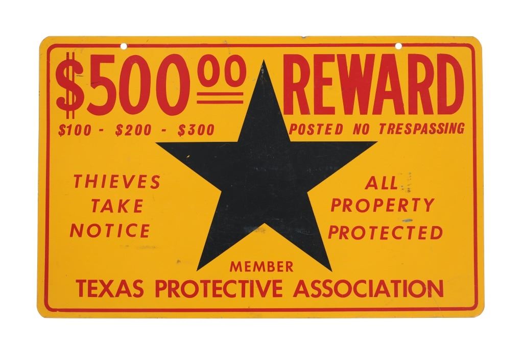 For your consideration is this Texas Protective Association reward sign. The sign shows a bright, vivid yellow with red lettering that reads "$500 Reward / Posted No Trespassing / Thieves Take Notice / All Property Protected / Member Texas Protective Association". The sign is in good condition and measures 10L x 15 3/4" W.