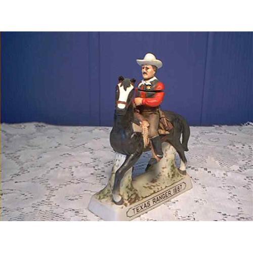 Whiskey Flask of horse and rider. The flask is marked "Texas Ranger 1887" with an emblem G.S.C. This whiskey flask is also marked "Another Grenadier © Orig. 1978". It measures 5.75 inches high and 5 inches wide and is in very good condition. The rein or rope is missing.