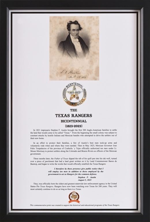 2023 Framed commemorative print, 13 x 20, with Stephen F. Austin print (1831). Sold to benefit the Texas Ranger Museum