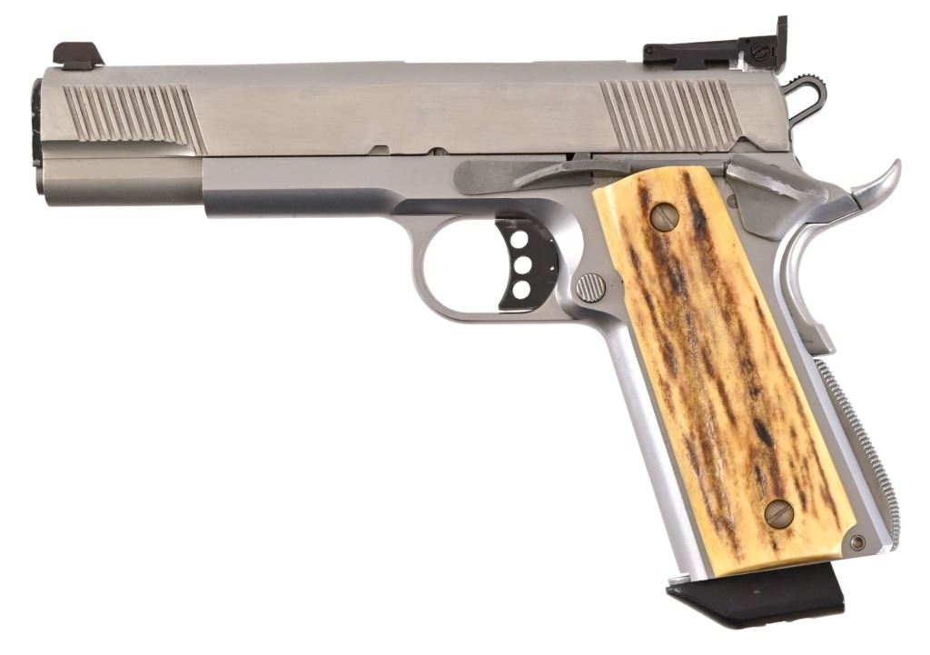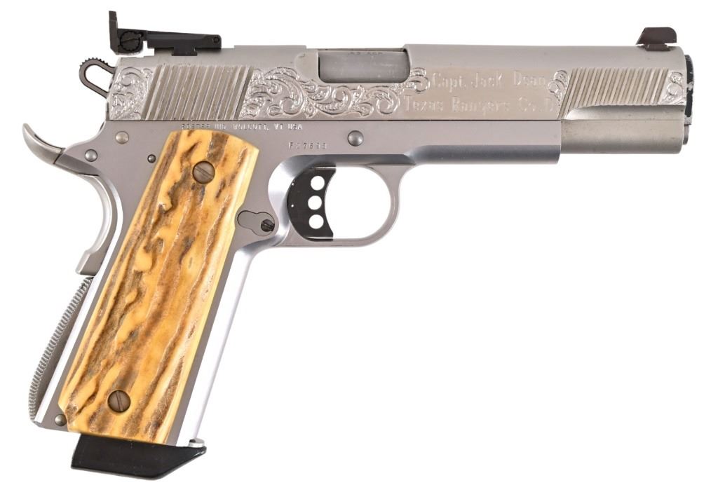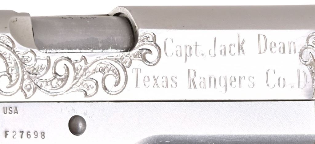 Duty carried by Texas Ranger Captain Jack Dean, S/N F27698. Custom built 1911 pistol built on a Foster S/S frame. Engraved Captain Jack Dean, Texas Rangers, Co. D. Stag grips, 5" barrel. Modern