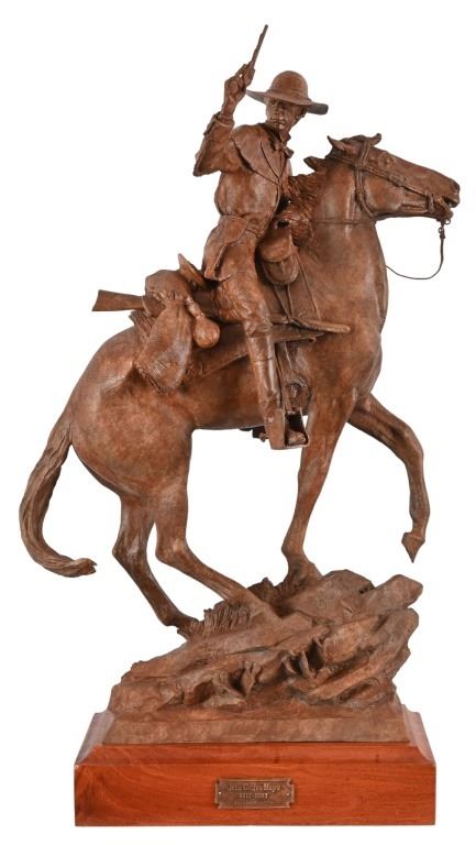 John Coffee Hays bronze (2002) measures 30" x 18" x 9” on wood base with name plate. Created by Cowboy Artists of America member Jason Scull of Kerrville, Texas. Jason Scull produced a 16 ft. monumental of this piece for the Hays County Courthouse in San Marcos (where it still stands today). Only 16 of these smaller castings were ever made.