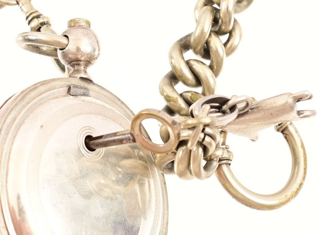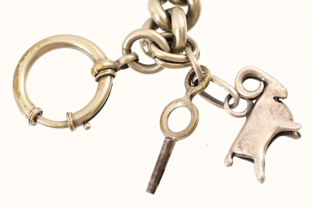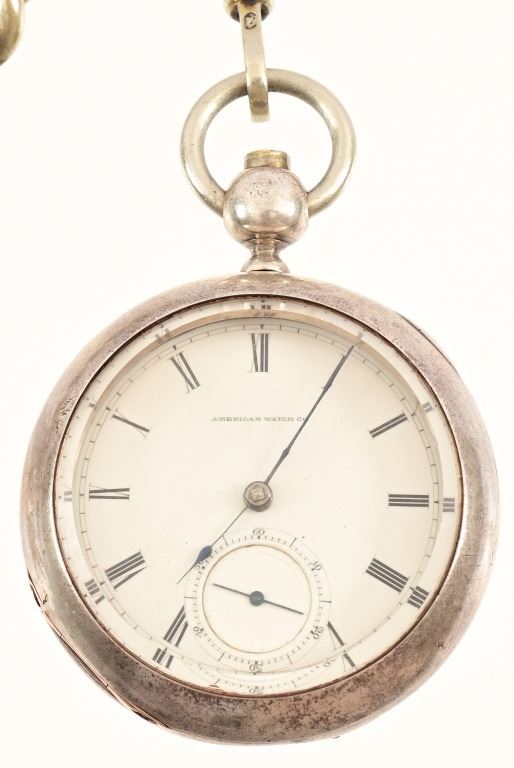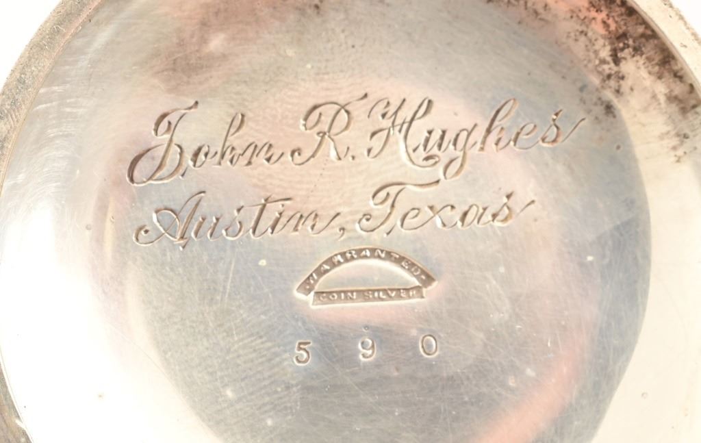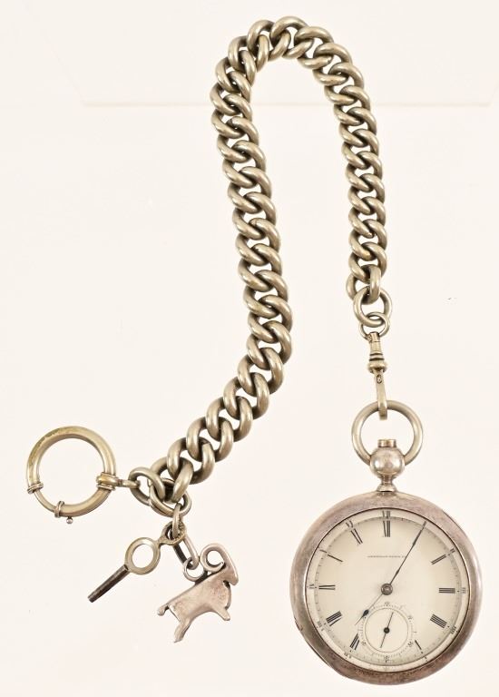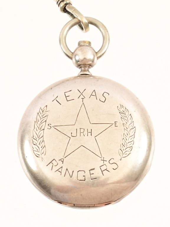 1871-1872 circa Waltham P.S. Bartlett 11-jewel pocket watch, mounted in coin silver American Watch Co. case. According to records only 2000 of these were produced at the time, this one specifically is engraved on the back of the case initials "JRH" surrounded by "Texas Rangers", with the inside of the case back engraved "John R. Hughes, Austin Texas". The watch is wound and adjusted with a key mounted to the 14.5" chain, key is Williams & Cooke patented Sept, 1, 1874. Also mounted on chain, is a silver ram charm figure.