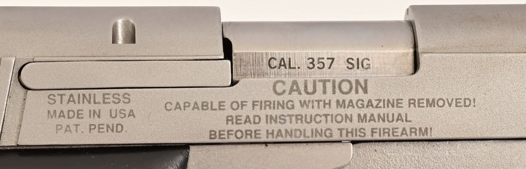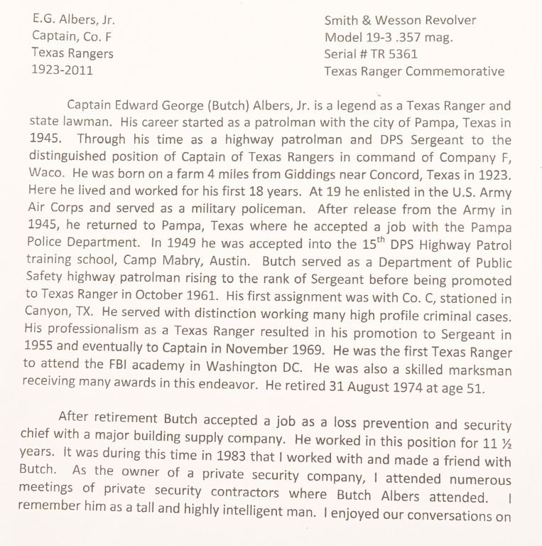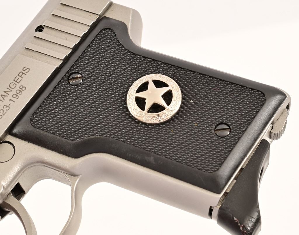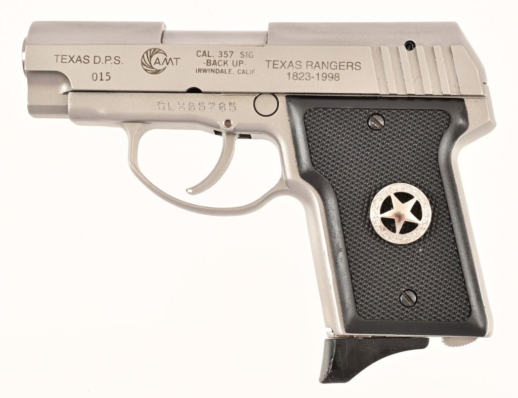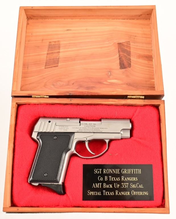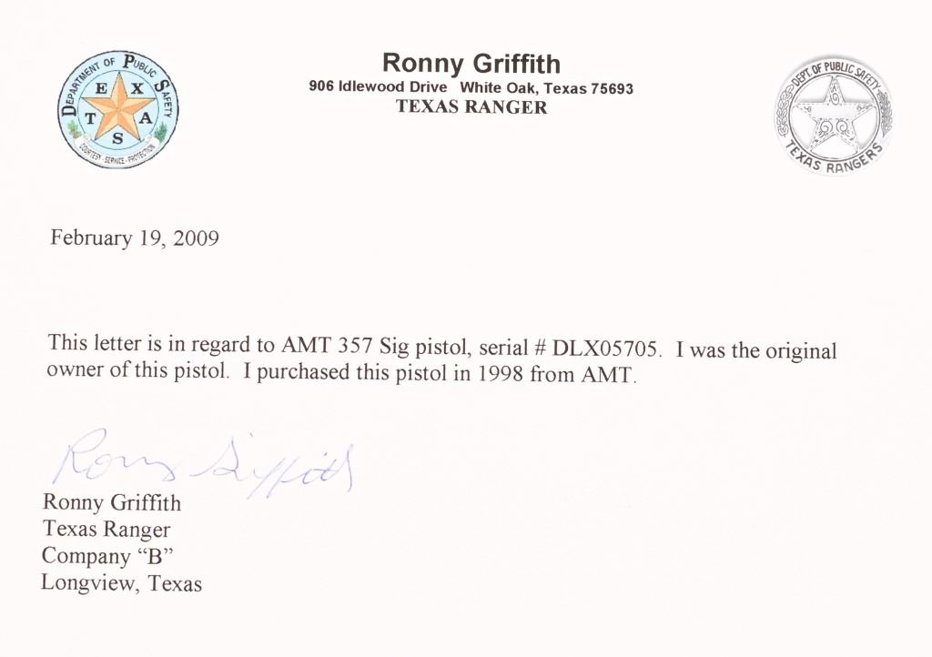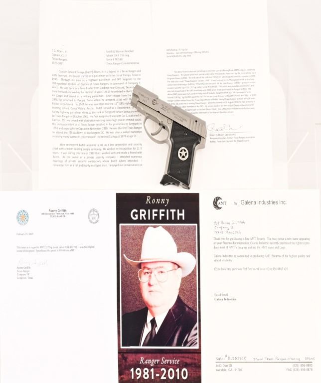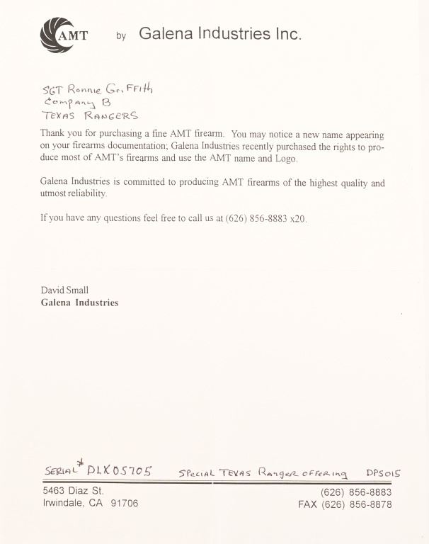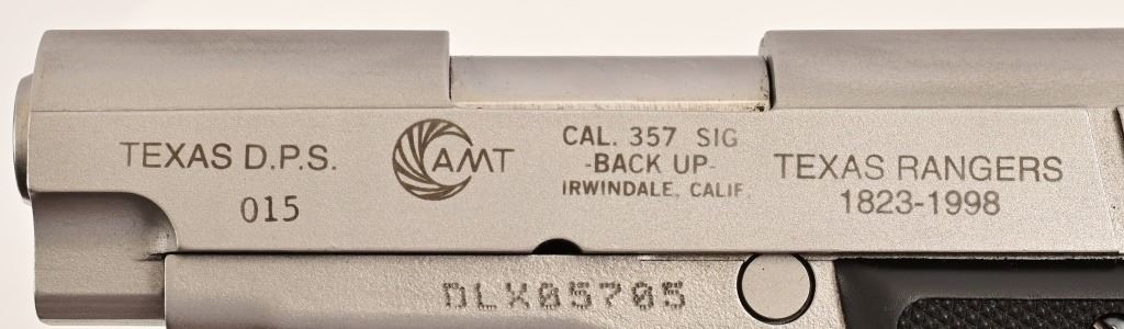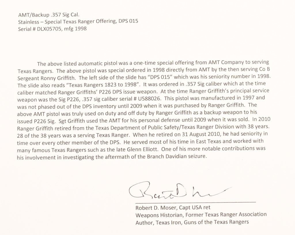 A special one-time offering from AMT Company to serving Texas Rangers. The pistol was special ordered in 1998 directly from AMT by the then serving Co. B Sergeant Ronny Griffith. The left side of slide has "DPS 015" which was his seniority number in 1998. The slide also reads "Texas Rangers 1823 to 1998". It was ordered in .357 Sig caliber, which at the time, caliber matched Ranger Griffiths' P226 DPS issue weapon. This pistol was used on duty and off duty by Ranger Griffith and personal defense until 2009. With signed letters of certification from Ranger Griffith and Robert D. Moser. Serial DLX05705. Also included is 1999 Texas Rangers "Company B" letter signed by all Company B Rangers.