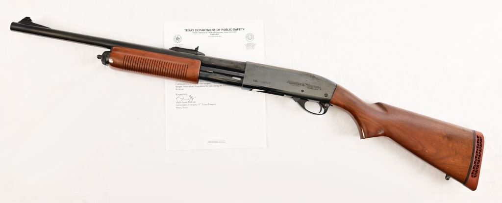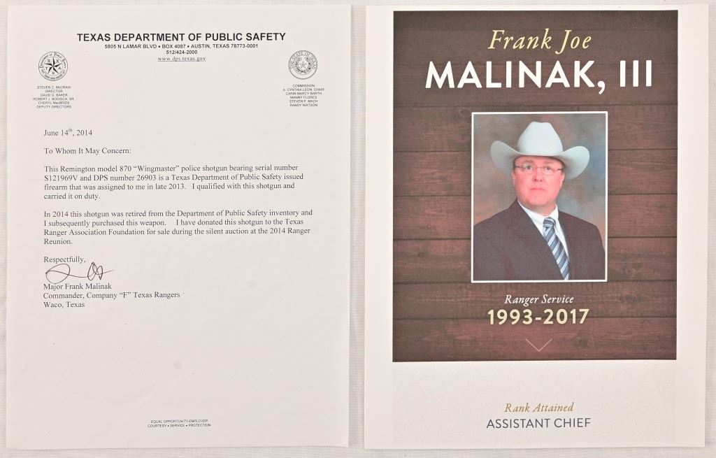 S/N S121969V, DPS numbered 26903. 12 Gauge, 20" barrel chambered 2 3/4 or shorter shells. Issued to and carried by Texas Ranger Major Frank Malinak in 2013, in 2014 the shotgun was retired from DPS and subsequently purchased by Malinak. Comes with signed DPS letterhead from Malinak.