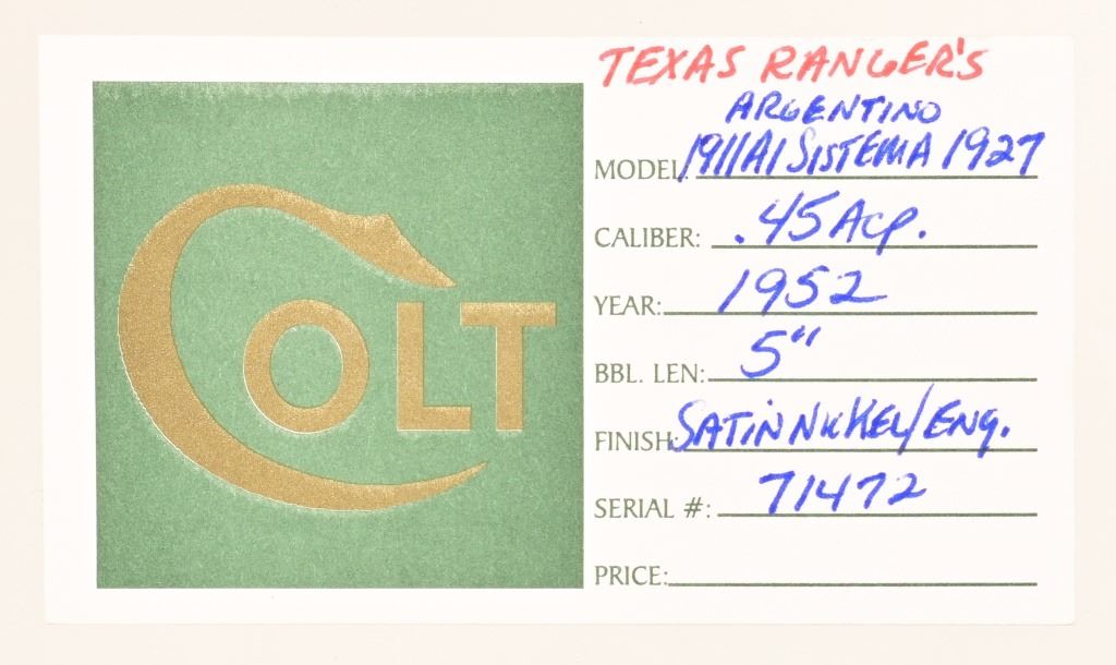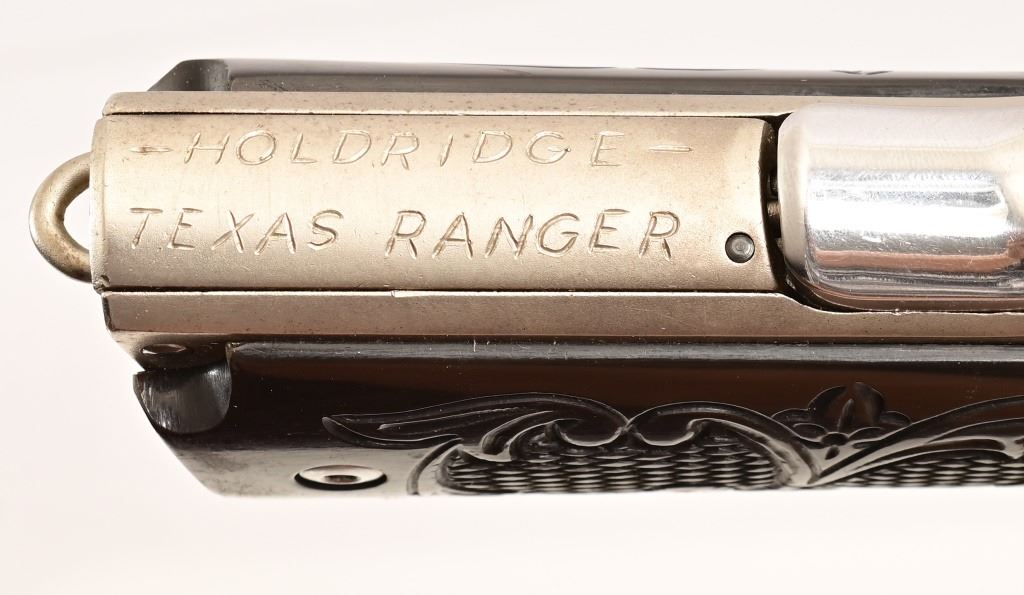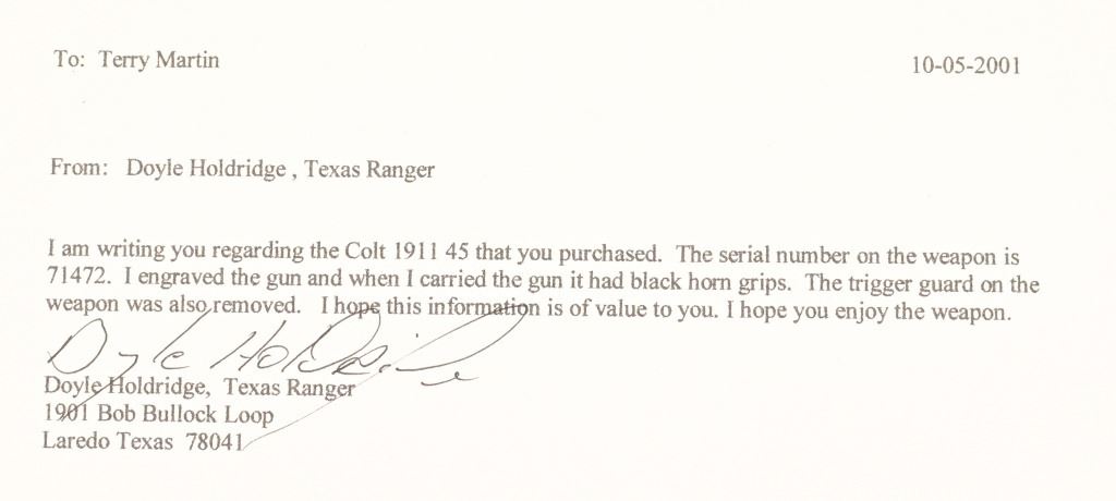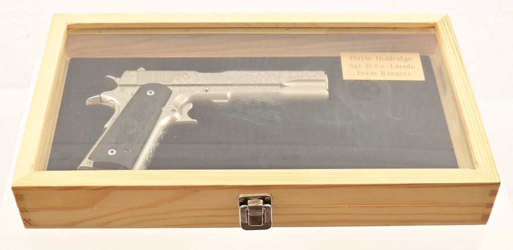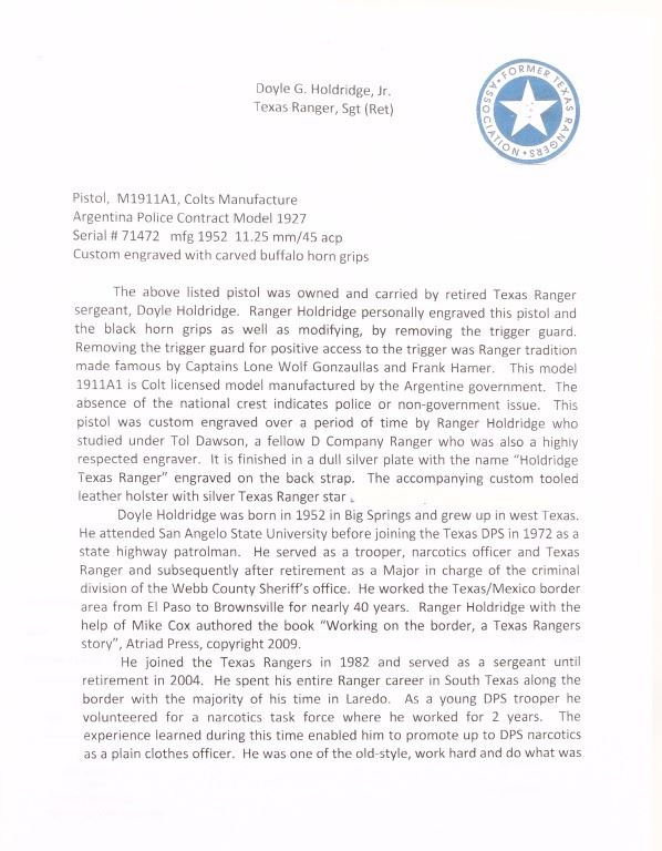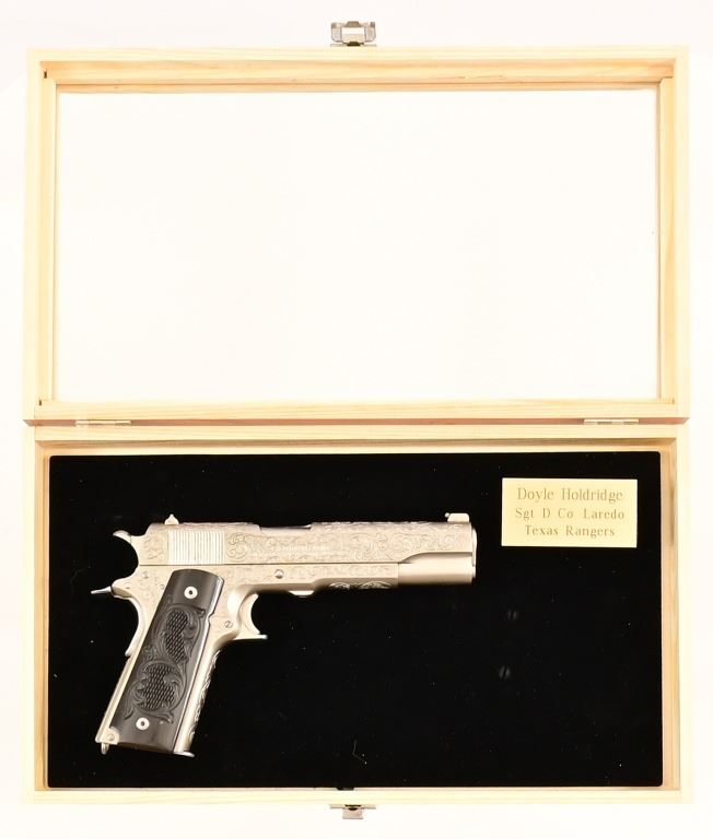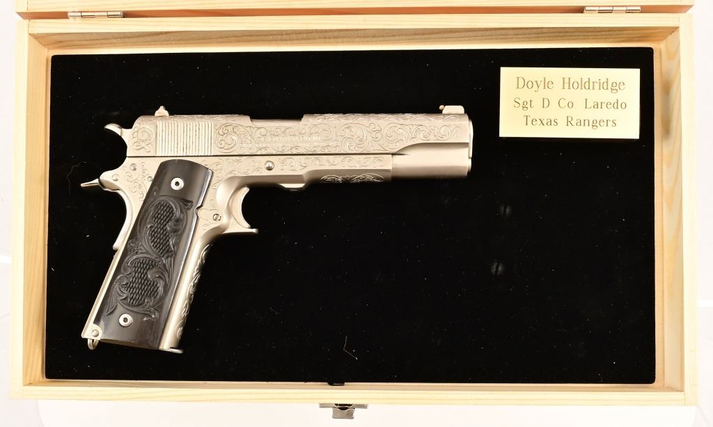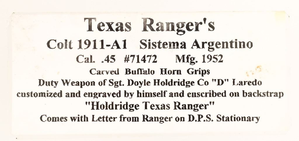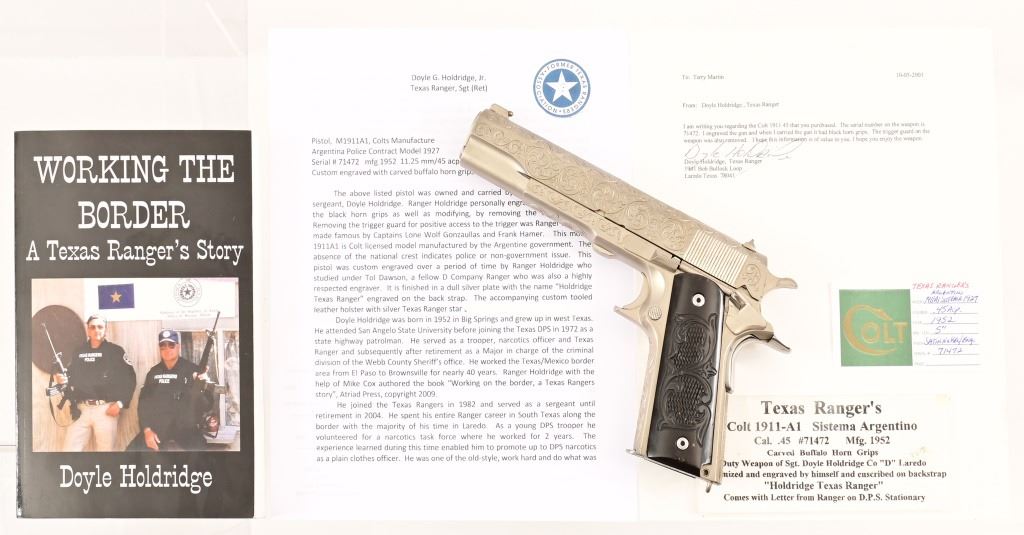 Colt M1911A1 Argentina Police Contract Model 1927. S/N 71472, manufactured 1952. Owned and carried by retired Texas Ranger Sergeant Doyle Holdridge. Ranger Holdridge personally engraved this pistol and the black buffalo horn grips, as well as having the trigger guard "bobbed" or removed for positive access, was Ranger tradition made famous by Captains Lone Wolf Gonzaullas and Frank Hamer. This model 1911A1 is Colt licensed model manufactured by the Argentine government. The absence of the national crest indicates police or non-government issue. This pistol was custom engraved over a period of time by Ranger Holdridge who studied under Tol Dawson, a fellow D Company Ranger who was also a highly respected engraver. It is finished in a satin stainless with the name "Holdridge Texas Ranger" engraved on the backstrap. With wood presentation case, and signed letter from Ranger Holdridge. Also includes a signed copy of his book "Working The Border, A Texas Ranger's Story".