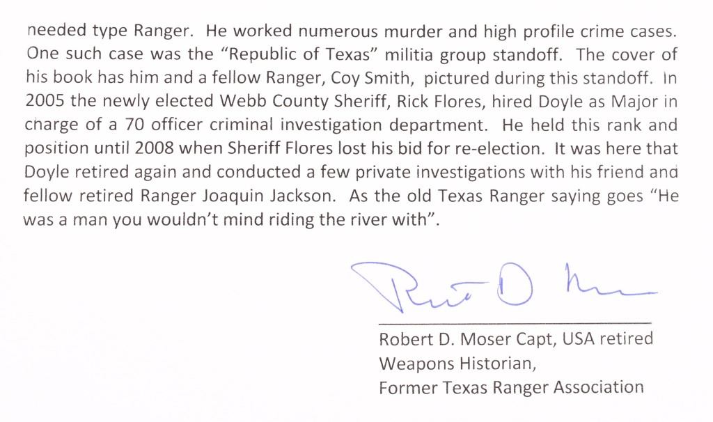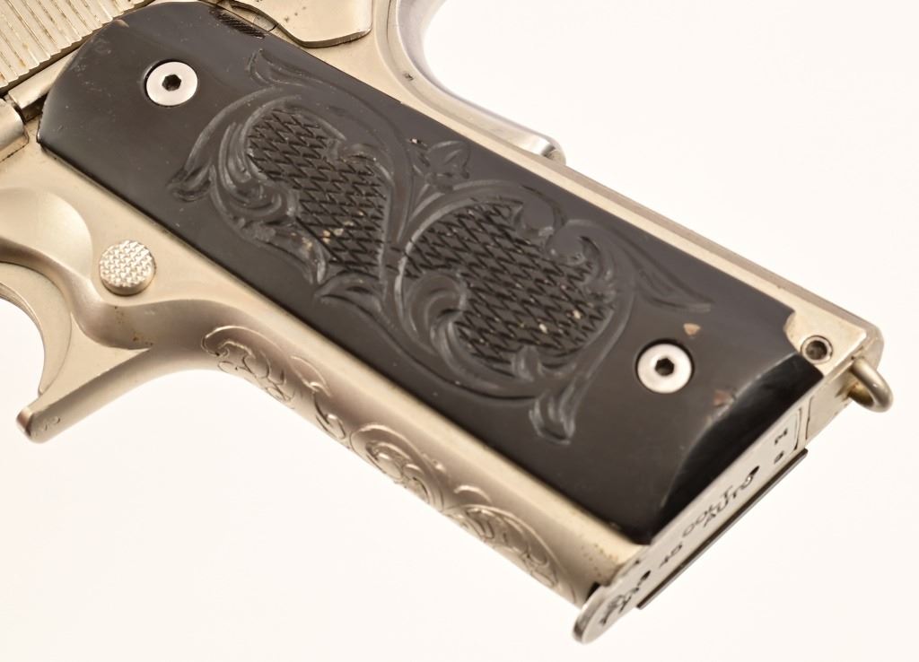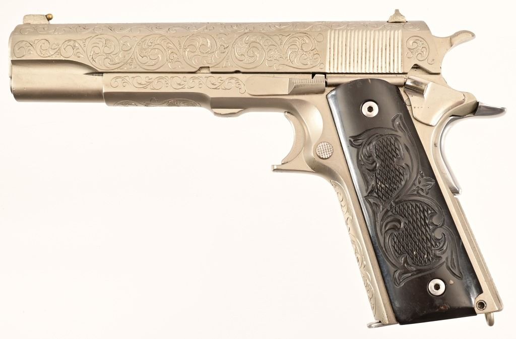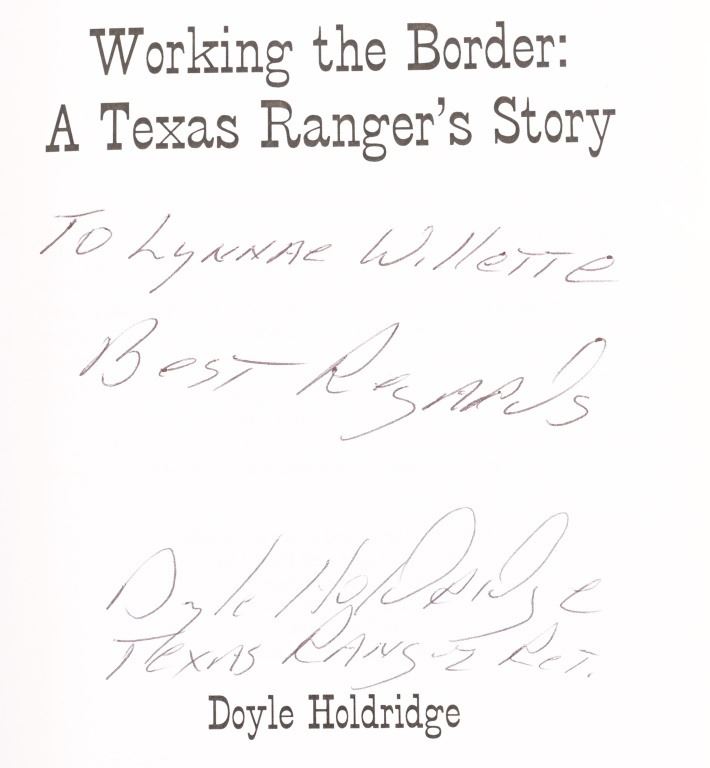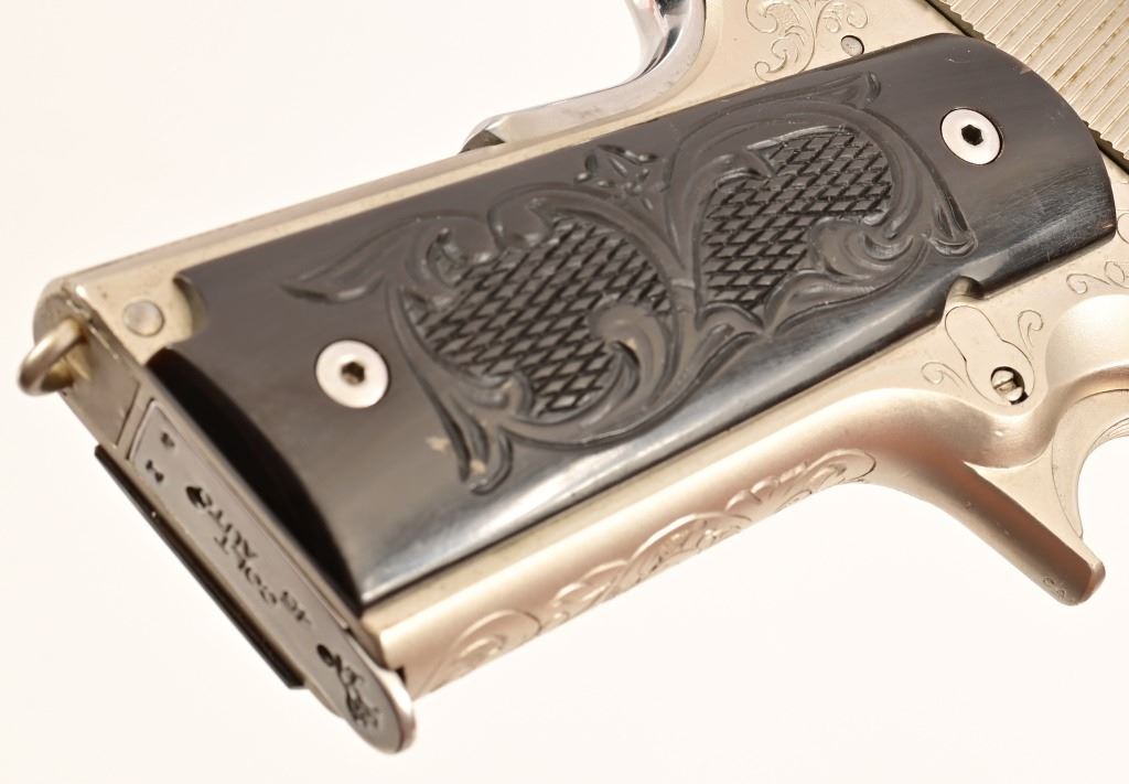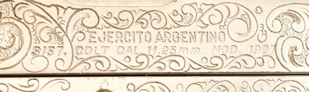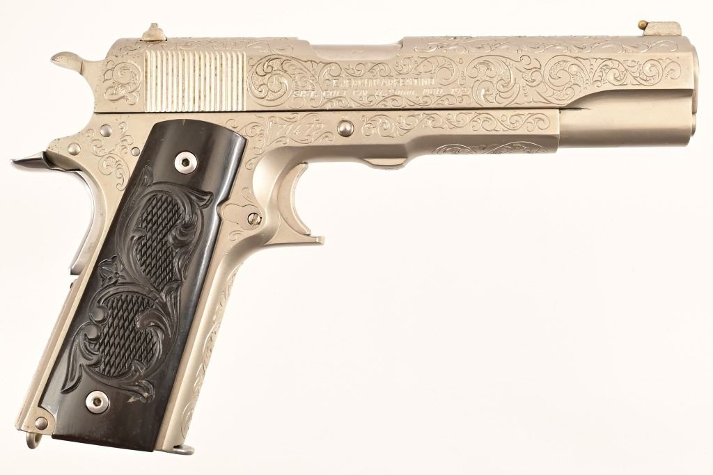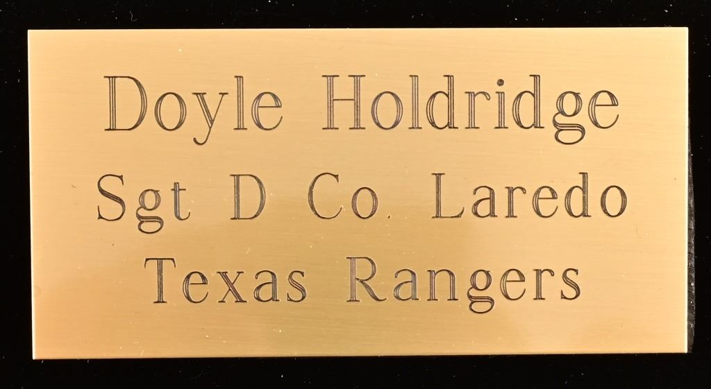 Colt M1911A1 Argentina Police Contract Model 1927. S/N 71472, manufactured 1952. Owned and carried by retired Texas Ranger Sergeant Doyle Holdridge. Ranger Holdridge personally engraved this pistol and the black buffalo horn grips, as well as having the trigger guard "bobbed" or removed for positive access, was Ranger tradition made famous by Captains Lone Wolf Gonzaullas and Frank Hamer. This model 1911A1 is Colt licensed model manufactured by the Argentine government. The absence of the national crest indicates police or non-government issue. This pistol was custom engraved over a period of time by Ranger Holdridge who studied under Tol Dawson, a fellow D Company Ranger who was also a highly respected engraver. It is finished in a satin stainless with the name "Holdridge Texas Ranger" engraved on the backstrap. With wood presentation case, and signed letter from Ranger Holdridge. Also includes a signed copy of his book "Working The Border, A Texas Ranger's Story".