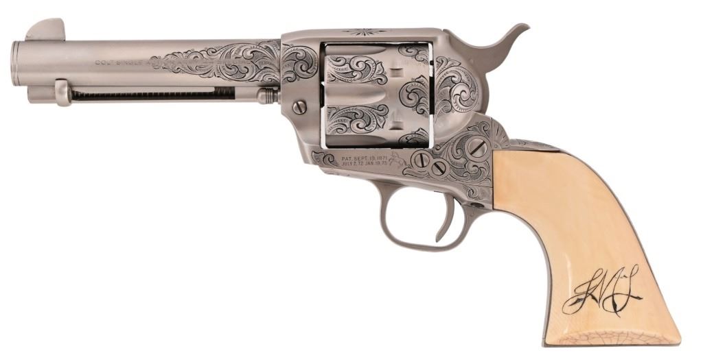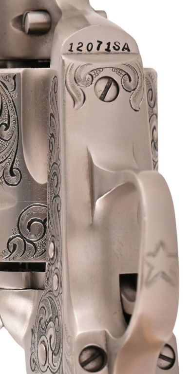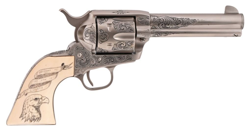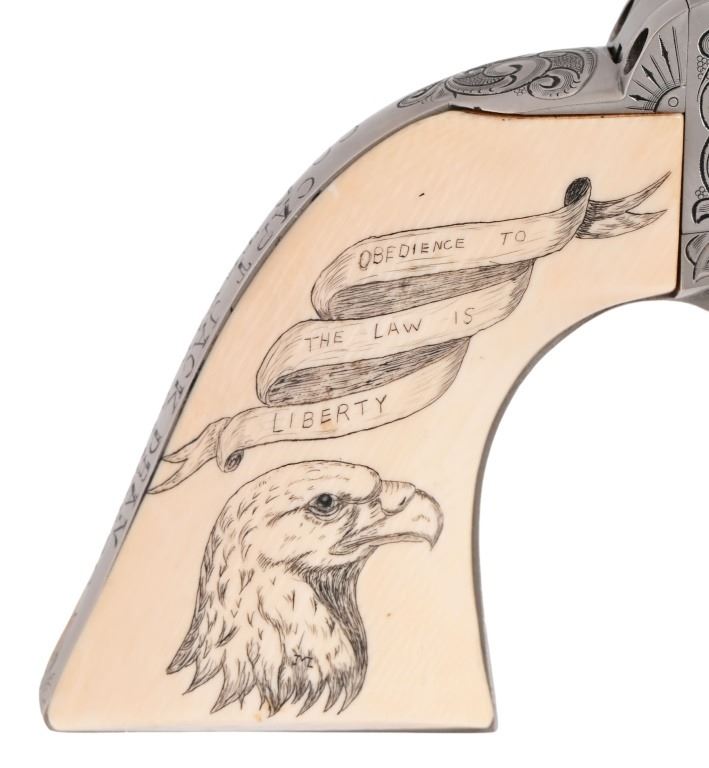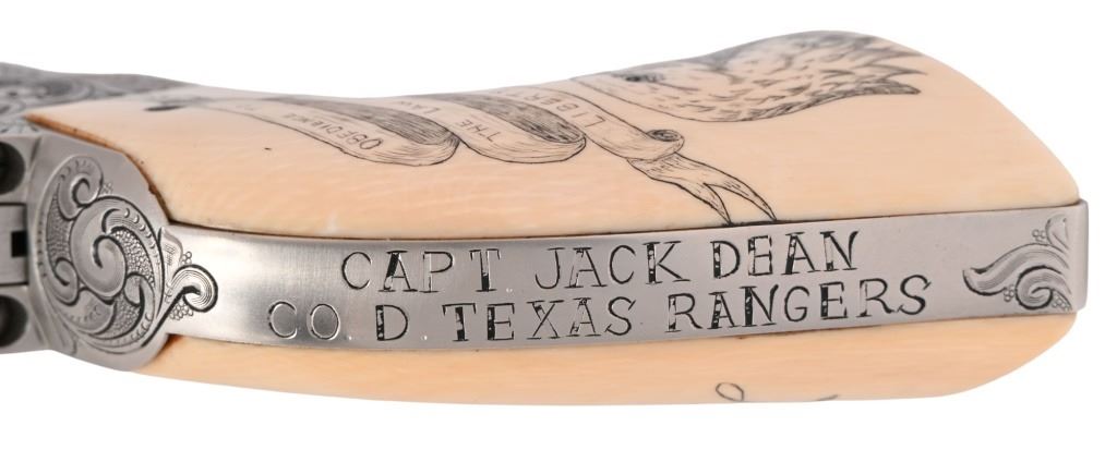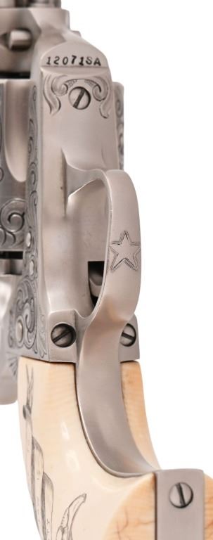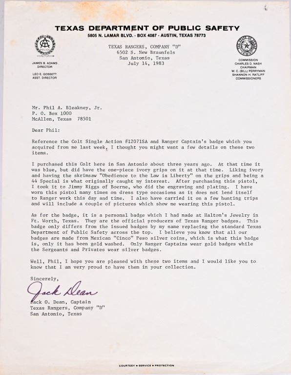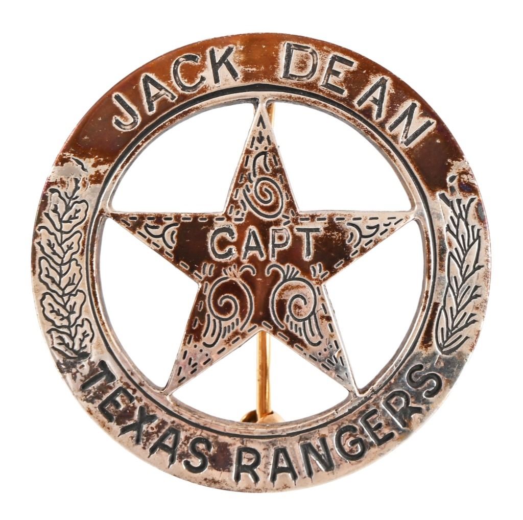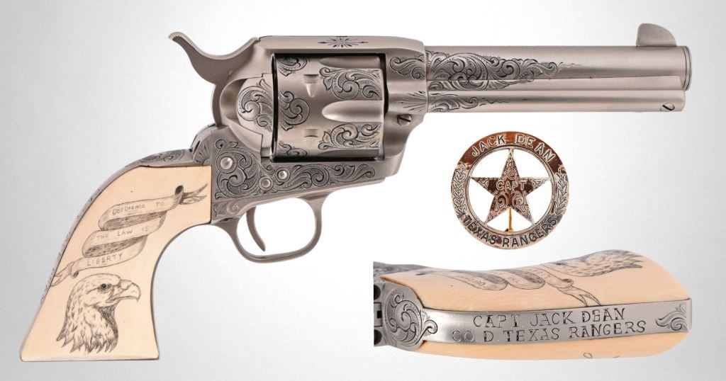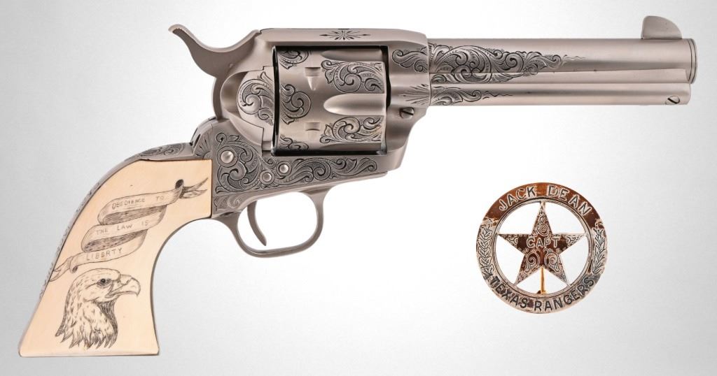 S/N 12071SA, .44 Spl. caliber, 4 3/4" barrel. Extensively engraved by Jimmy Riggs of Boerne, TX. One pc. custom Ivory grips, scrimshaw reads "Obedience to the Law is Liberty" on right grip. Manufactured 1957. Modern firearm. Ranger Dean personally had badge made by Haltom's Jewelry, Ft. Worth TX, the official producers of Texas Ranger badges. Badge is from "Cinco" Peso silver coin that has been gold washed. Only Ranger Captains wear gold badges. Comes with COA on both gun and badge from Ranger Jack Dean.