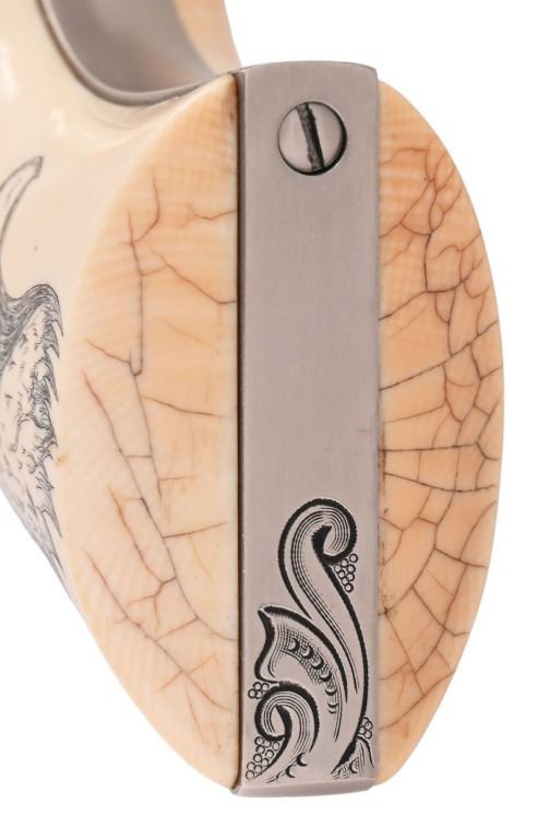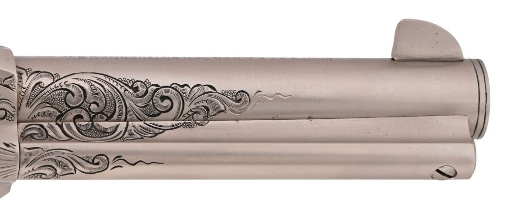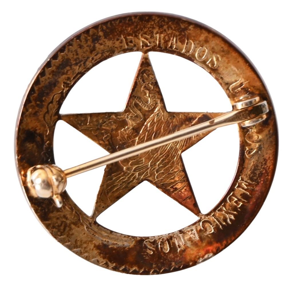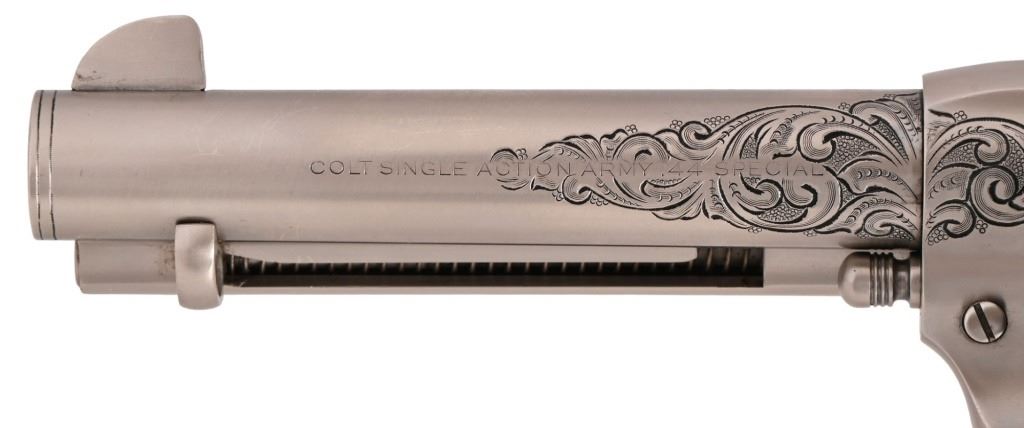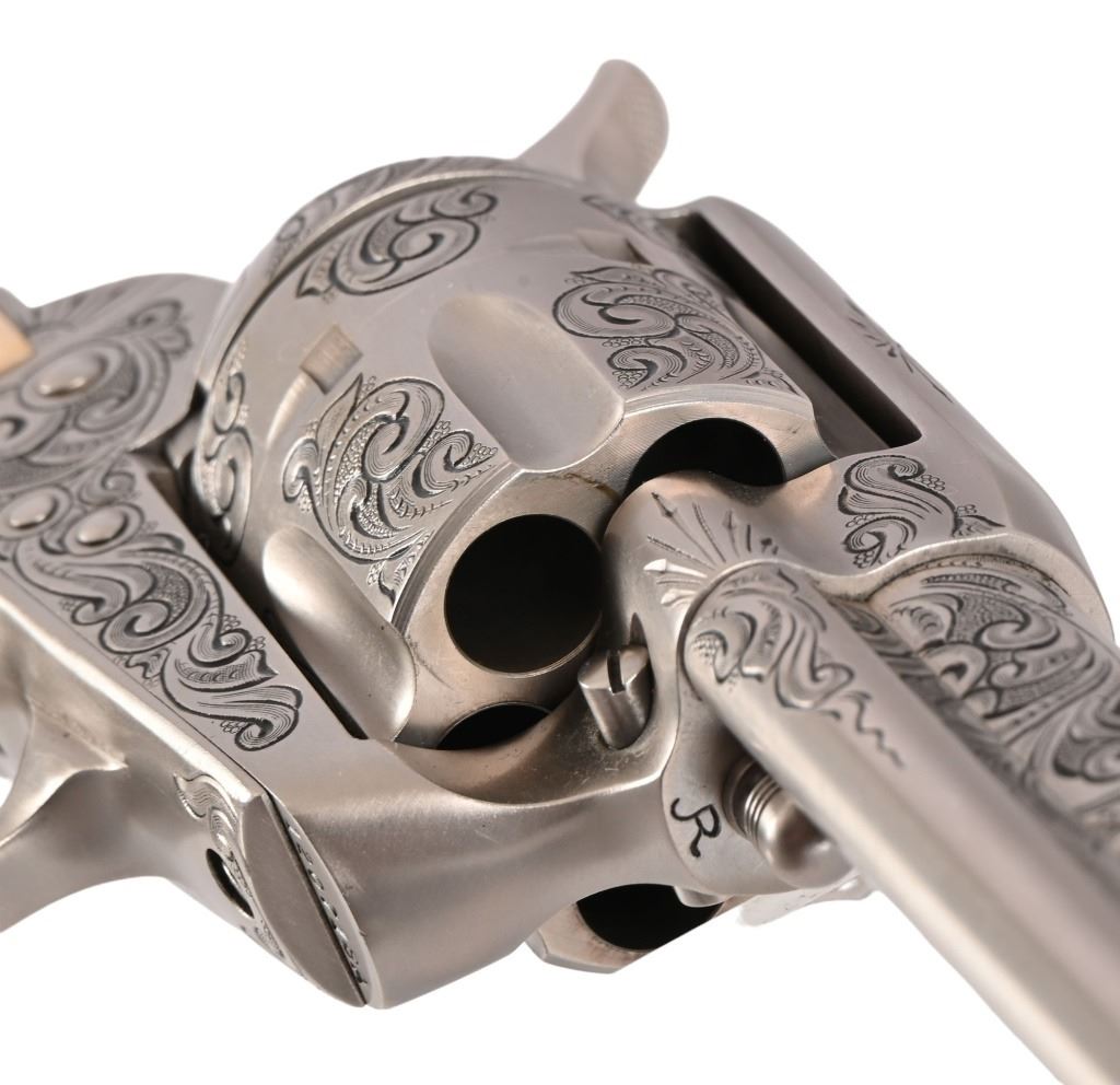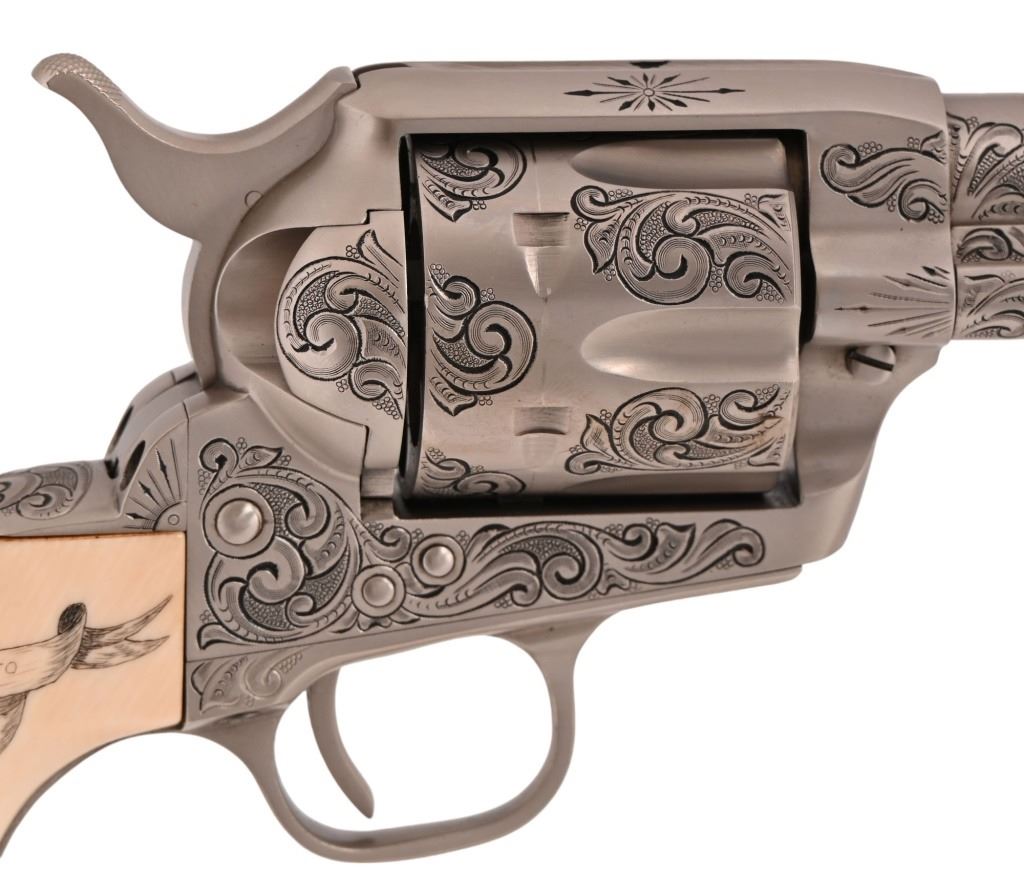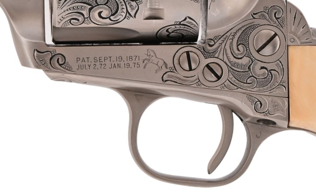 S/N 12071SA, .44 Spl. caliber, 4 3/4" barrel. Extensively engraved by Jimmy Riggs of Boerne, TX. One pc. custom Ivory grips, scrimshaw reads "Obedience to the Law is Liberty" on right grip. Manufactured 1957. Modern firearm. Ranger Dean personally had badge made by Haltom's Jewelry, Ft. Worth TX, the official producers of Texas Ranger badges. Badge is from "Cinco" Peso silver coin that has been gold washed. Only Ranger Captains wear gold badges. Comes with COA on both gun and badge from Ranger Jack Dean.