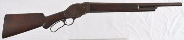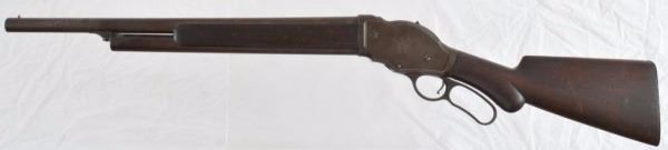 1887 Winchester riot gun. Manufactured in1889. The barrel length is 21" making it easy to carry in a saddle scabbard, Because of its relatively short length,it was favored by many early Texas Rangers and peace officers.