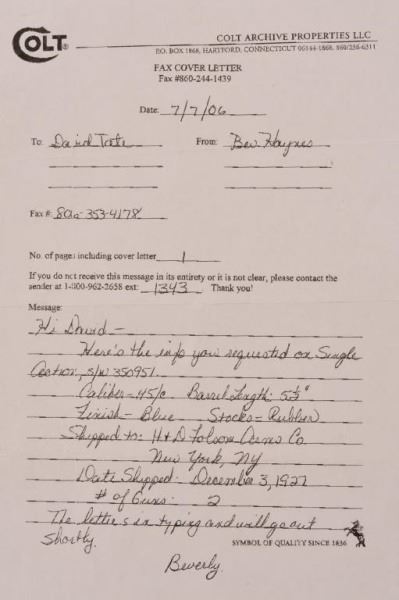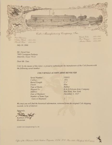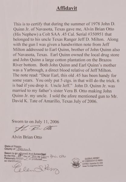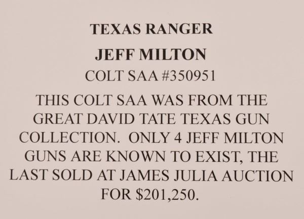 * Comes with provenance letter from Jeff Milton & his nephew who inherited it. Also comes with a factory letter & a copy of the book "Jeff Milton".Important Texas Ranger gun. The only other firearm belonging to Jeff Milton that was sold at auction for $150,000 & the same gun sold 5 years later for $200,000.