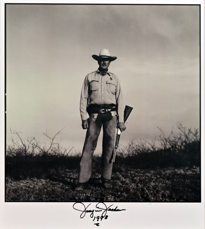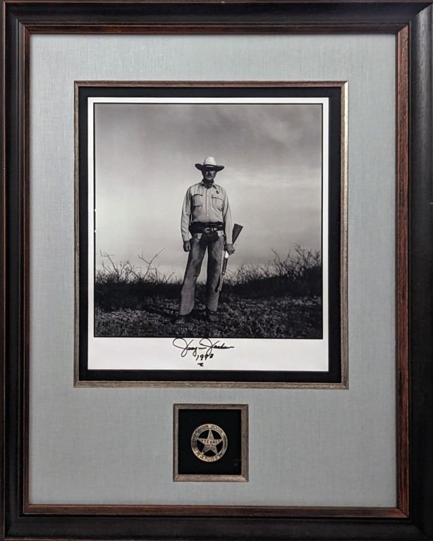 "One Ranger", This is a print of the signed, original, 1993 photograph by internationally acclaimed photographer Dan Winters. It is museum framed with an exact duplicate of Joaquin’s personal badge, hand cut from a Mexican cinco peso coin (mfg. 1947-1948, .900 coin silver). This photograph was first published as the cover of the February 1994 issue of Texas Monthly magazine. In 1998 it was selected from among thousands of photographs as the cover for the 25th Anniversary book, The Pictures of Texas Monthly (Texas Monthly, Inc. 1998).