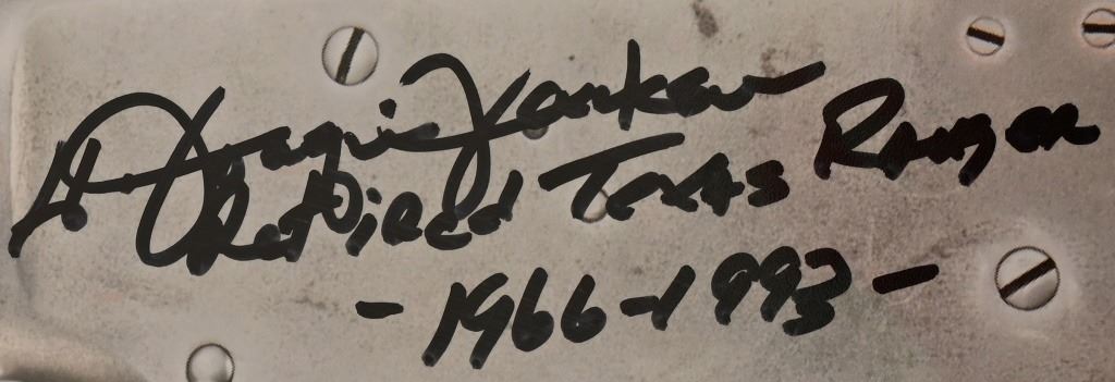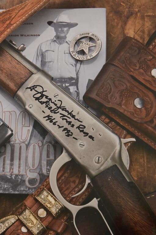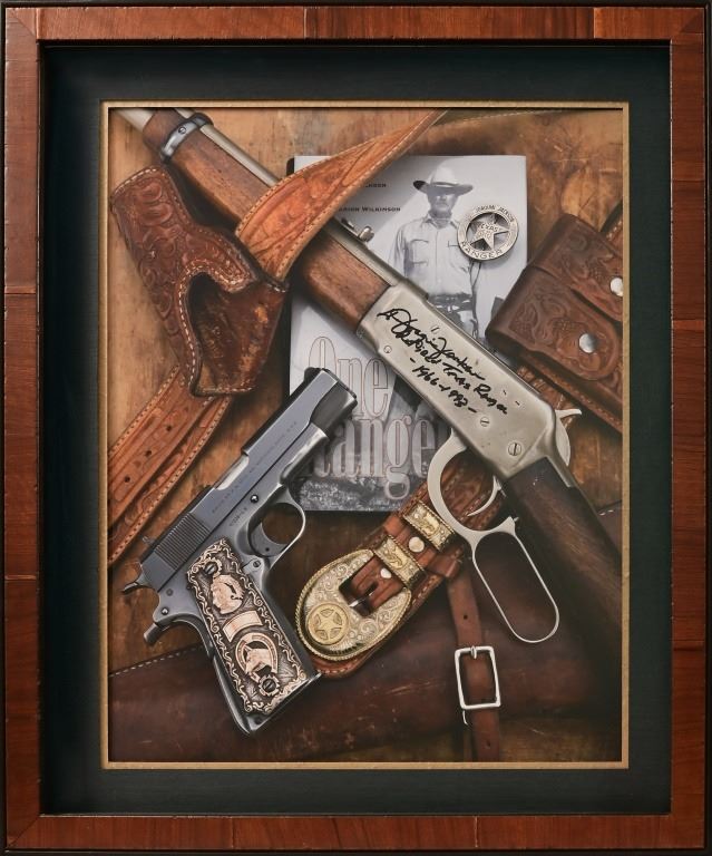 "Tools of the Trade", Custom framed 21.5" x 24.5", signed original photo of Joaquin Jackson's pistol, carbine, badge, gunbelt and book. Personally inscribed by Jackson, "Retired Texas Ranger 1966-1993." Very rare as this is one of only 3 prints of this photograph personally signed by Jackson before his death in 2016.
