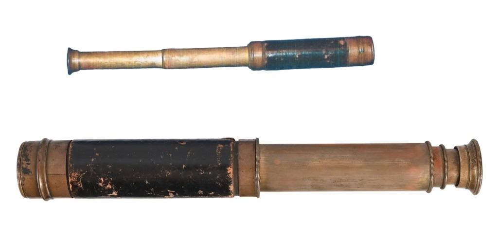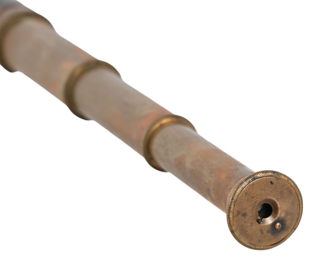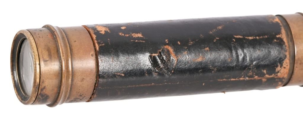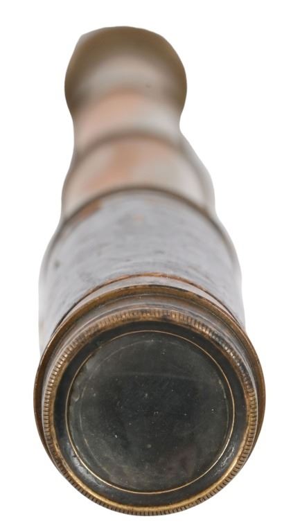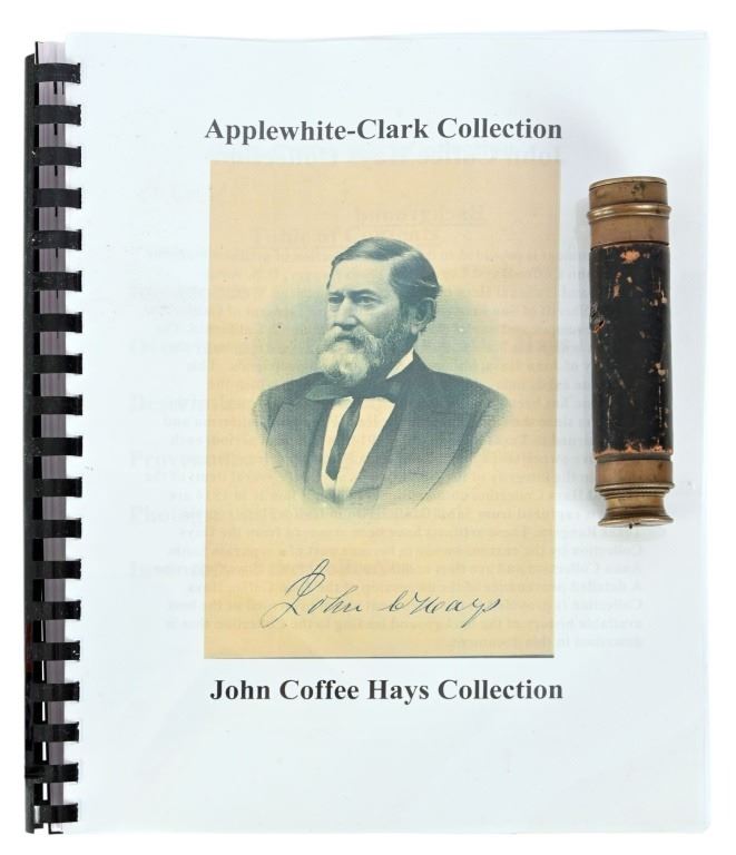 Antique brass scouting telescope from the personal collection of Legendary Texas Ranger Jack C. Hays. Measures 5.5" retracted, 13.25" fully extended. From the Applewhite-Clark Collection. Legendary Texas Ranger, first Sheriff of San Francisco in 1849. Texas State Historical Association describes Jack C. Hays as: HAYS, JOHN COFFEE (1817–1883).John Coffee (Jack) Hays, Texas Ranger extraordinary and Mexican War officer, son of Harmon and Elizabeth (Cage) Hays, was born at Little Cedar Lick, Wilson County, Tennessee, on January 28, 1817. His father, of Scots-Irish descent, fought with Andrew Jackson and Sam Houston in the War of 1812. Hays became the prototypical Texas Ranger officer, and he and his cohorts—John S. (Rip) Ford, Ben McCulloch, and Samuel H. Walker established the ranger tradition. Hays joined the Texas Rangers in the formative years of their role as citizen soldiers. His rangers gained a reputation as mounted troops with revolvers and individually styled uniforms, who marched and fought with a noticeable lack of military discipline. This rough-and-ready image of an irregular force left its imprint on the chronicles of ranger history. In the thirteen years that he lived in Texas, Hays mixed a military career with surveying. At an early age he left home, surveyed lands in Mississippi, attended Davidson Academy at Nashville, and decided to cast his lot with the rebels in the Texas Revolution. In 1836 he traveled to New Orleans and entered Texas at Nacogdoches in time to join the troops under Thomas J. Rusk and bury the remains of victims of the Goliad Massacre. Houston advised Hays to join a company of rangers under Erastus (Deaf) Smith for service from San Antonio to the Rio Grande, under the orders of Col. Henry W. Karnes. In this role Hays took part in an engagement with Mexican cavalry near Laredo, assisted in the capture of Juan Sánchez, and rose to the rank of sergeant. After appointment as deputy surveyor of the Bexar District, Hays combined soldiering and surveying for several years. The more he learned about Indian methods of warfare, the better he protected surveying parties against Indian attacks. Hays proved to be an able leader and fearless fighter (called "Devil Yack"), who gained the respect of the rank and file of the Texas Rangers. Yet his stature-five feet nine inches-his fair complexion, and his mild manners did not match the looks and actions of the legendary ranger in later popular culture. From 1840 through 1846 Hays, at first a captain, then a major, and his ranger companies, sometimes with Mexican volunteers and such Indian allies as Lipan chief Flacco, engaged the Comanches and Mexican troops in small skirmishes and major battles. Important military actions took place at Plum Creek, Cañón de Ugalde, Salado (against Mexican soldiers under Adrián Woll), and Walker's Creek. In these battles Hays and his rangers were usually outnumbered, and their effective use of revolvers revolutionized warfare against Texas Indians. The Texas Rangers gained a national reputation in the Mexican War. Into Mexico rode Hays's rangers. Out of Mexico came a mounted irregular body of rangers celebrated in song and story throughout the United States. This transformation in fact and fiction started with the formation of the First Regiment, Texas Mounted Riflemen, under Colonel Hays. Serving with the army of Gen. Zachary Taylor, the rangers marched, scouted, and took part in the attack on Monterrey in 1846. The next year Hays formed another regiment that participated in keeping communication and supply lines open between Veracruz and Mexico City for the troops under the command of Gen. Winfield Scott. In doing so, Hays's rangers fought Mexican guerrillas near Veracruz and at such places as Teotihuacán and Sequalteplán. Controversy between the rangers and the Mexican people still lingers, for they robbed and killed each other off the battlefields. In the years that followed the Mexican War, Hays pioneered trails through the Southwest to California and became a prominent citizen of that state. In 1848 he tried unsuccessfully to find a route between San Antonio and El Paso, and the following year he received an appointment from the federal government as Indian agent for the Gila River country. In addition, he was elected sheriff of San Francisco County in 1850, appointed United States surveyor general for California in 1853, became one of the founders of the city of Oakland, and ran successful enterprises in real estate and ranching. 6. He married Susan Calvert in 1847, and they had three daughters and three sons. Hays died on April 21, 1883, and is buried in California. Hays County, Texas, is named in his honor.