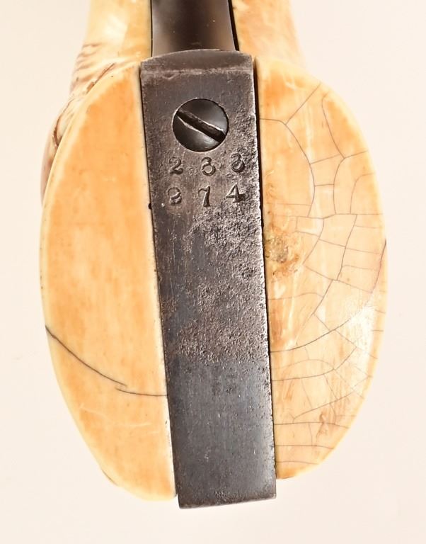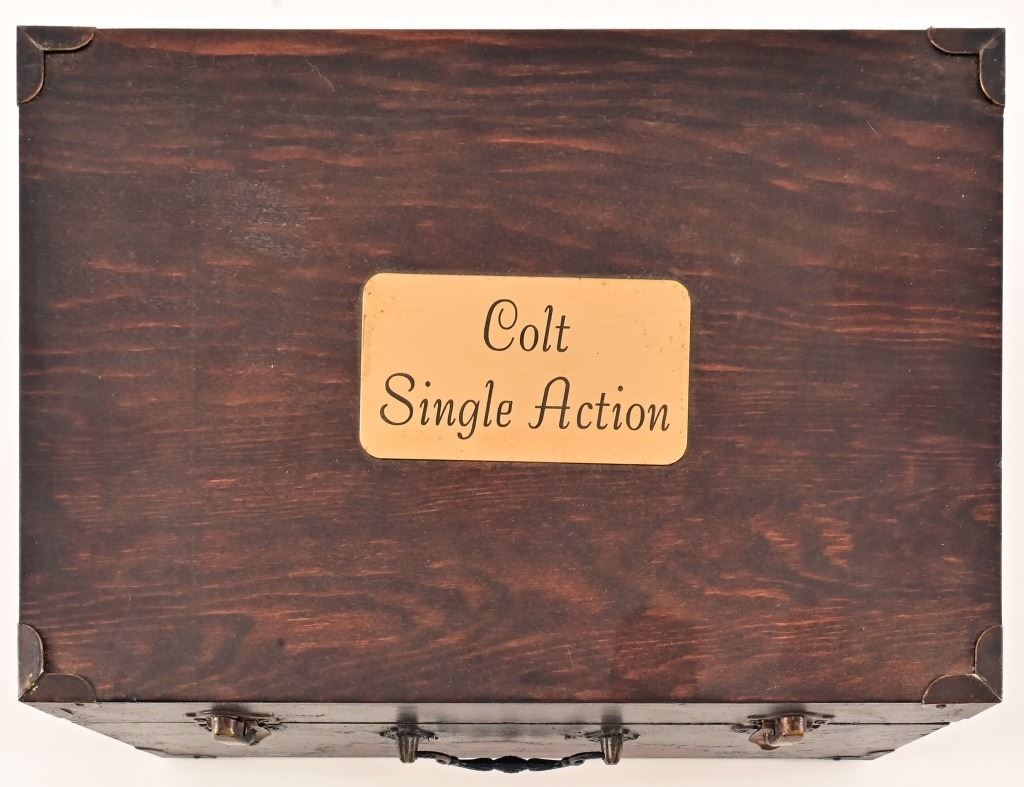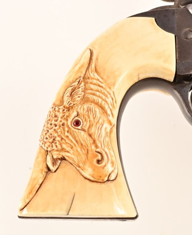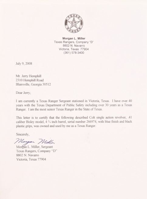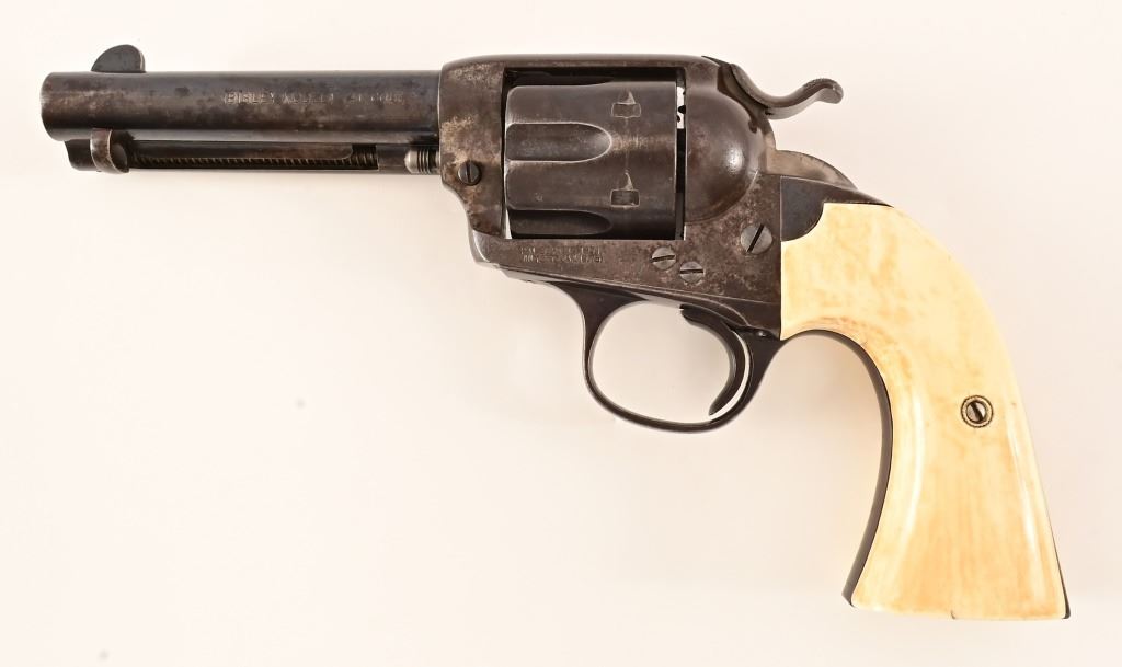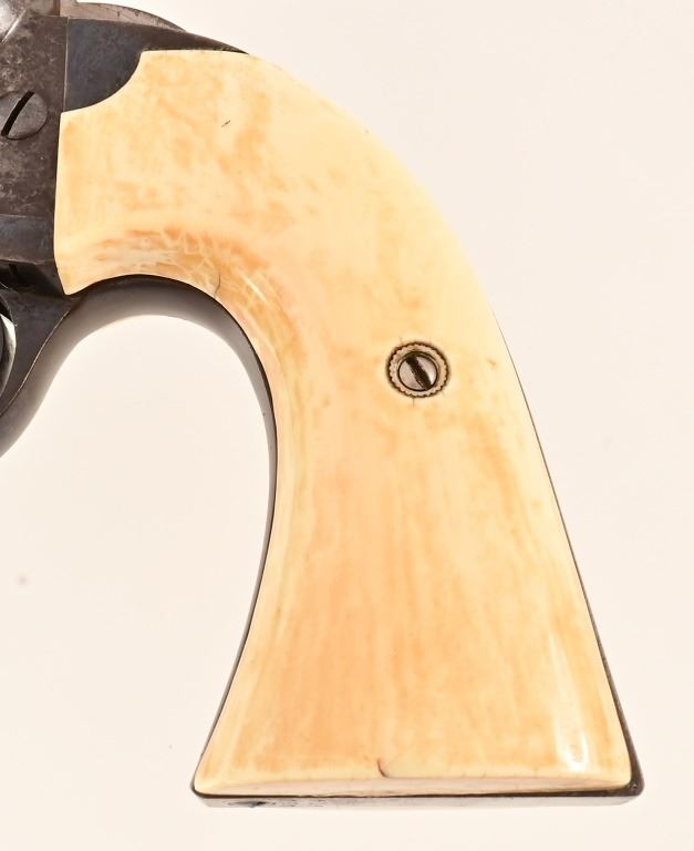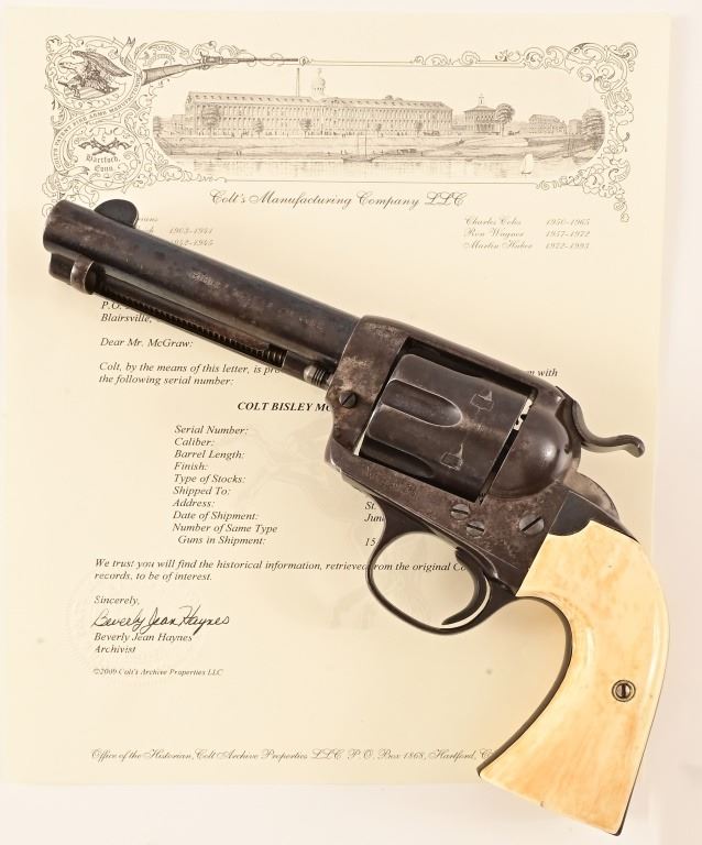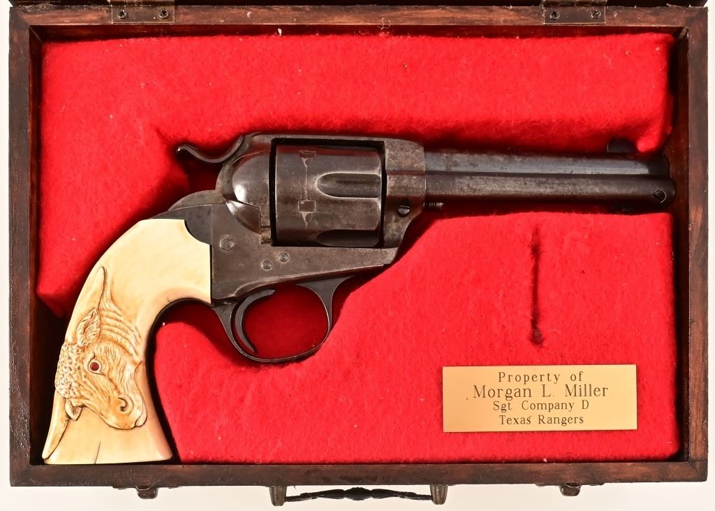S/N 266974. Blue finish, 4.75" barrel, ivory steerhead grips. Wood presentation case. Factory letter shows shipment to Norvell Shapleigh hardware St. Louis Missouri, June 1, 1905. Provenance includes signed letter from Texas Ranger Sergeant Morgan L. Miller.
