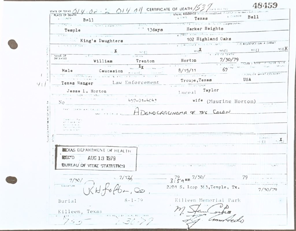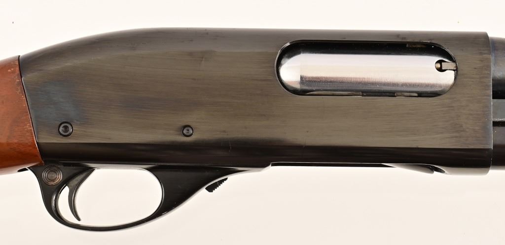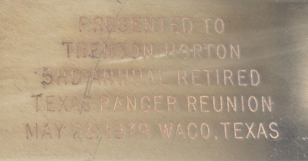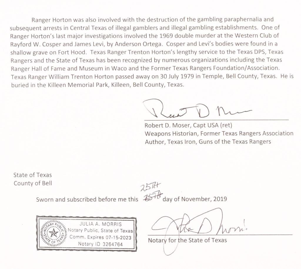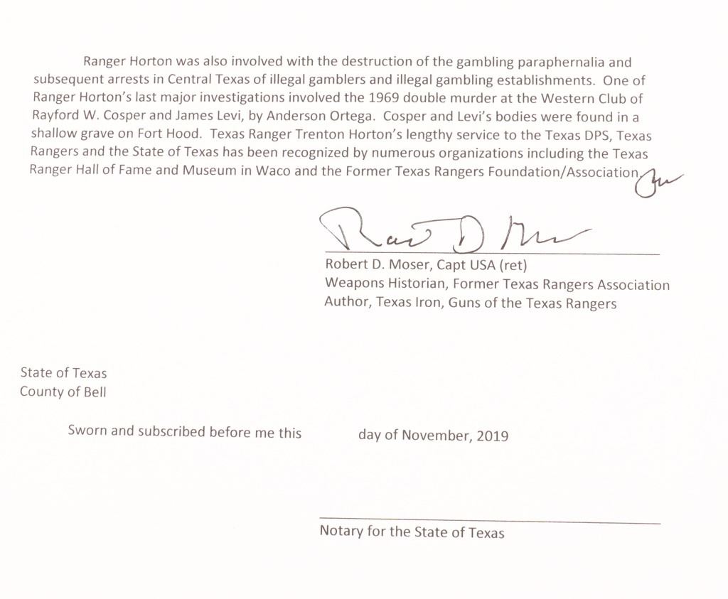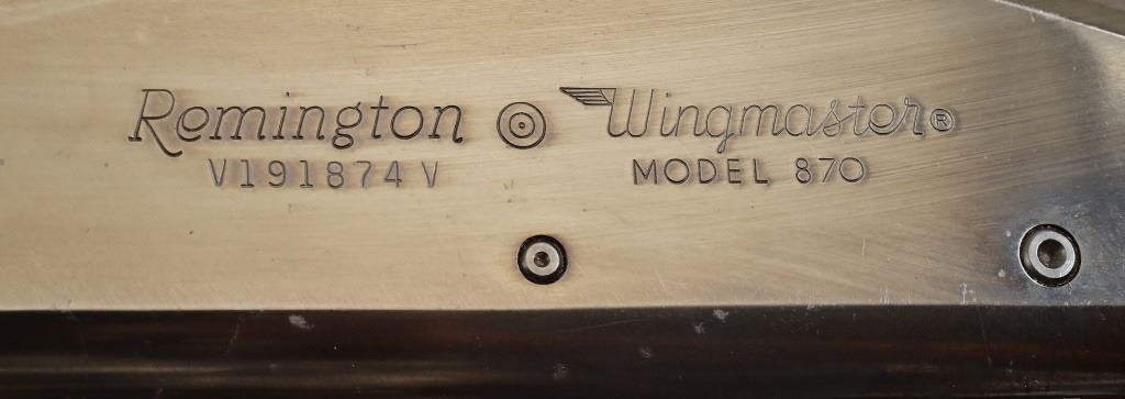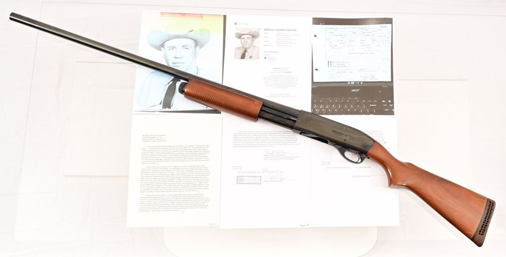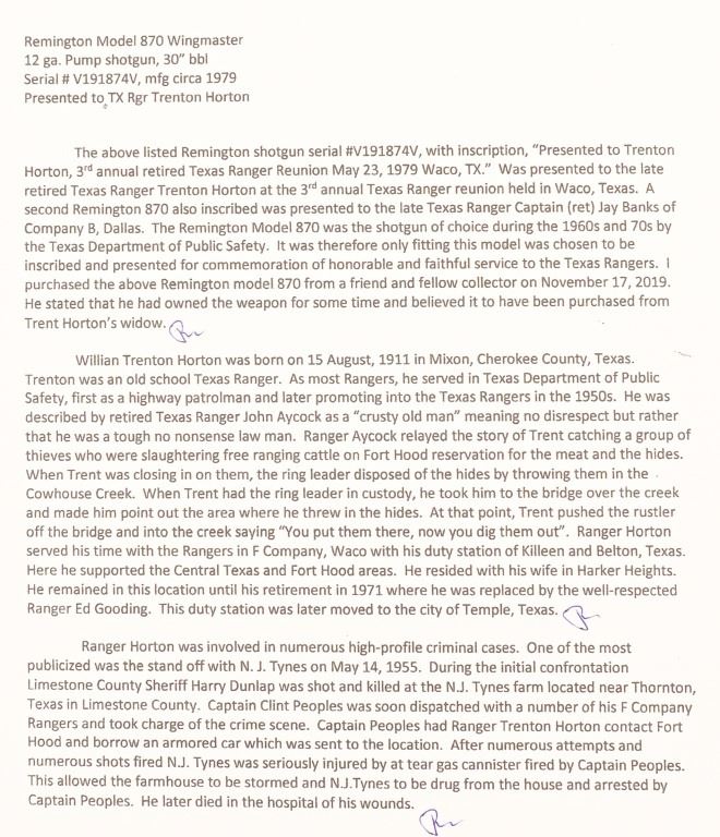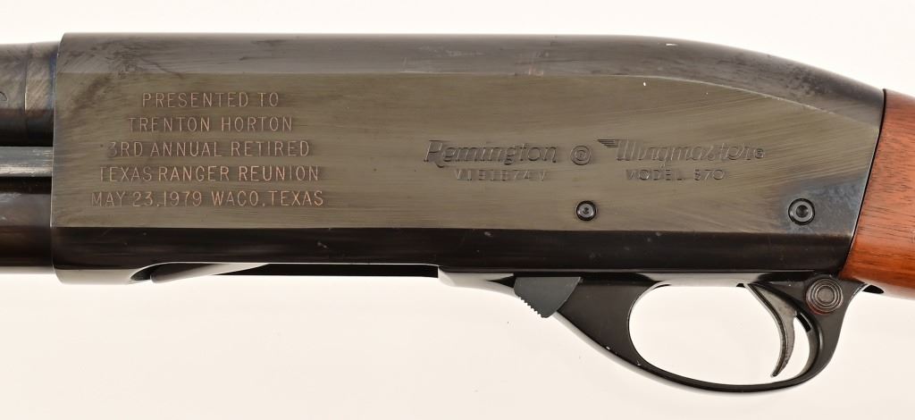 Remington 870 Wingmaster 12 gaugepump shotgun. 30" barrel chambered for 2 3/4 " or shorter shells. Presented to the late retired Texas Ranger Trenton Horton, as the receiver inscription reads "Presented to Trenton Horton, 3rd Annual Retired Texas Ranger Reunion May 23, 1979 Waco, TX." Serial V19874V, comes with signed and notarized letter from Robert D. Moser along with document folder.