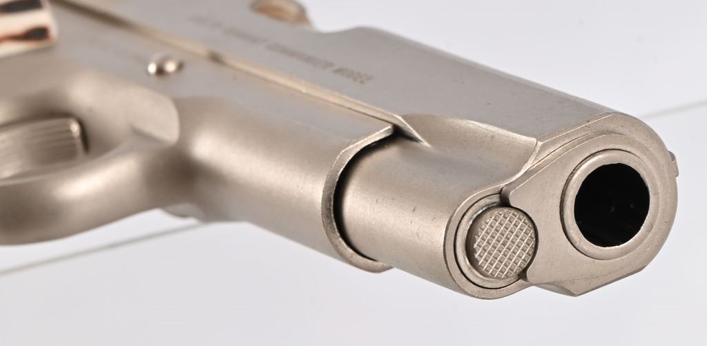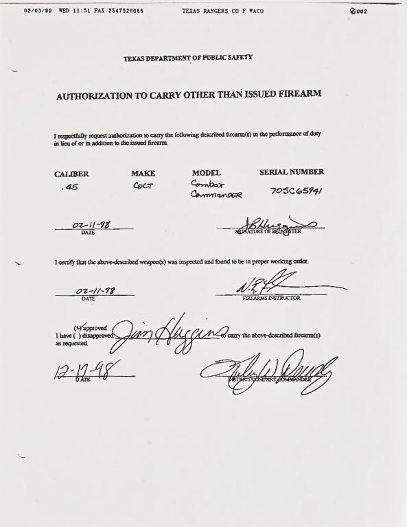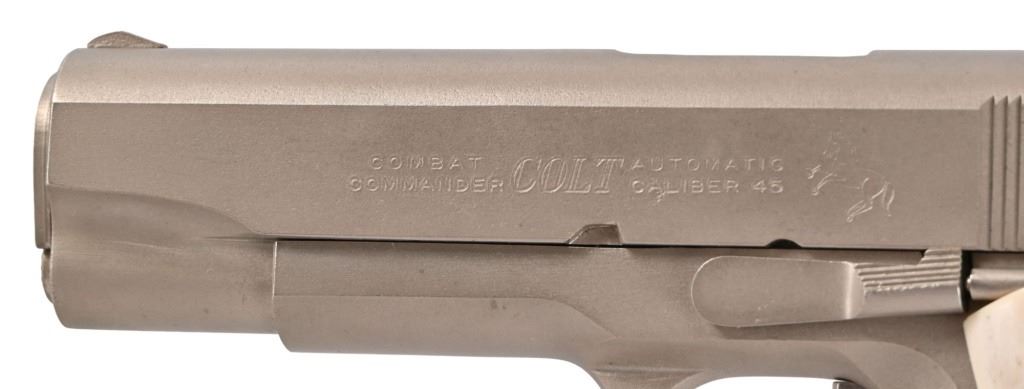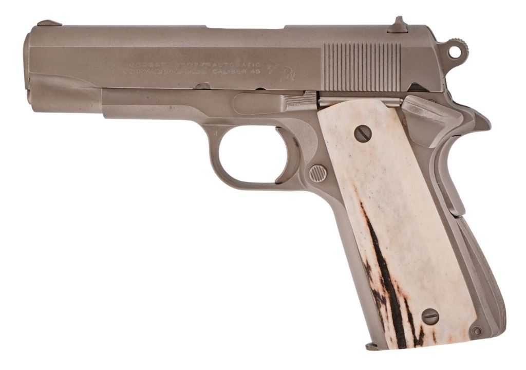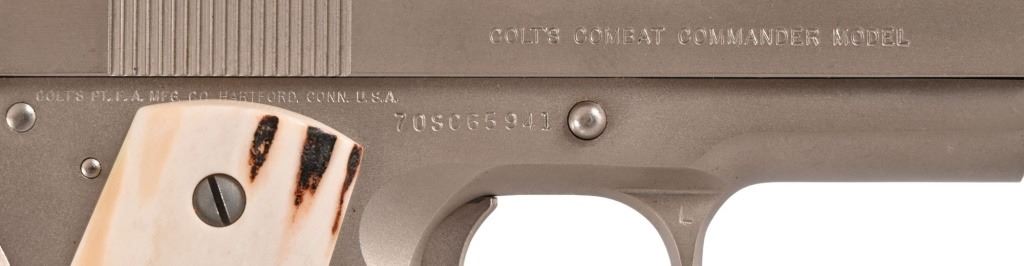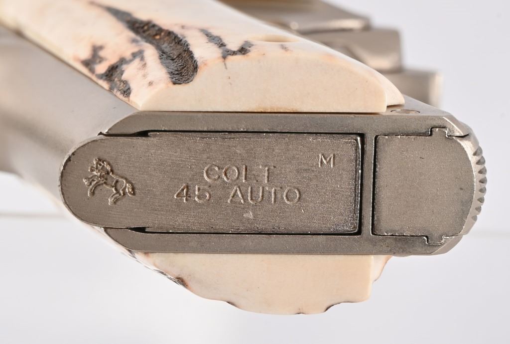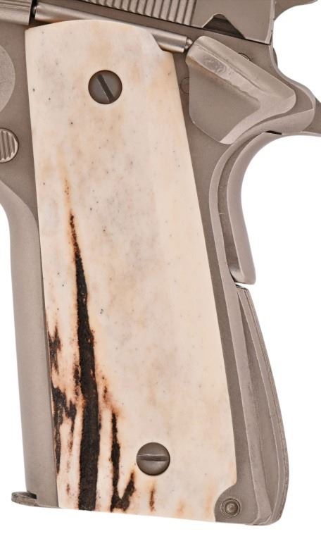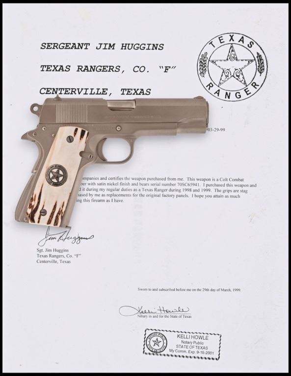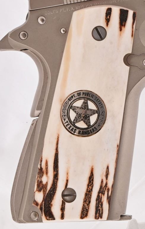 S/N 70SC65941, .45 ACP, manufactured 1977. Custom Sambar stag grips with Texas Ranger badge inlay. Very nice condition and bore. Modern firearm. Comes with COA from Jim Huggins.