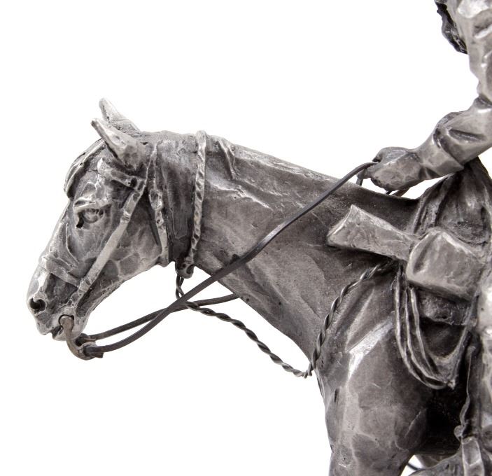Available in this lot we have an original cast Worcester Pewter sculpture by Philip Kraczkowski named, "Texas Ranger Trackin'' from 1972. Kraczkowski was a well known artist from Massachusetts alive from 1916-1996. The piece shows a Texas Ranger on horseback following and looking for tracks. The ranger is shown with a pistol on his hip and a badge on his chest. This item shows exceptional detail and is in very good condition. This item is displayed on a marble base. It measures 2.75" wide, 5.75" length and 5.75" in height.